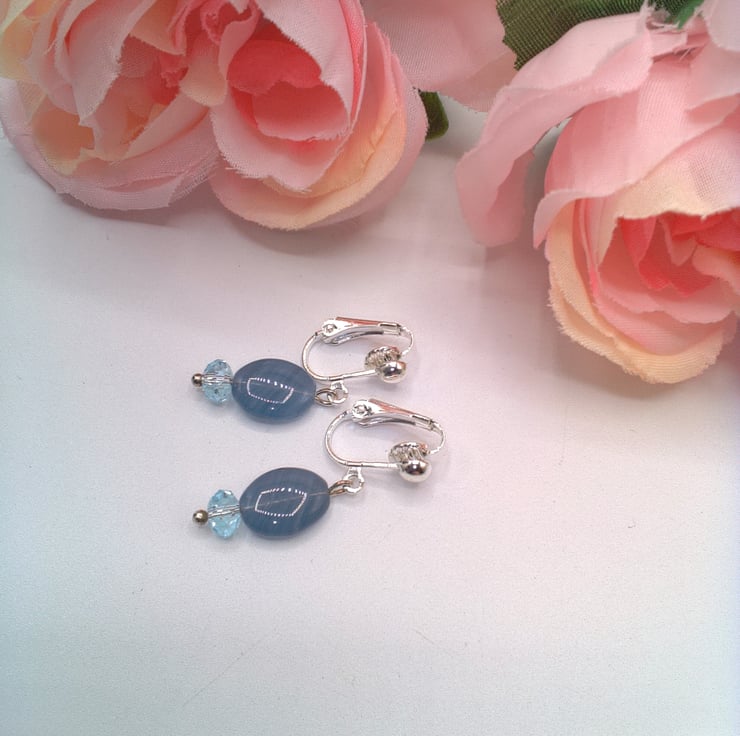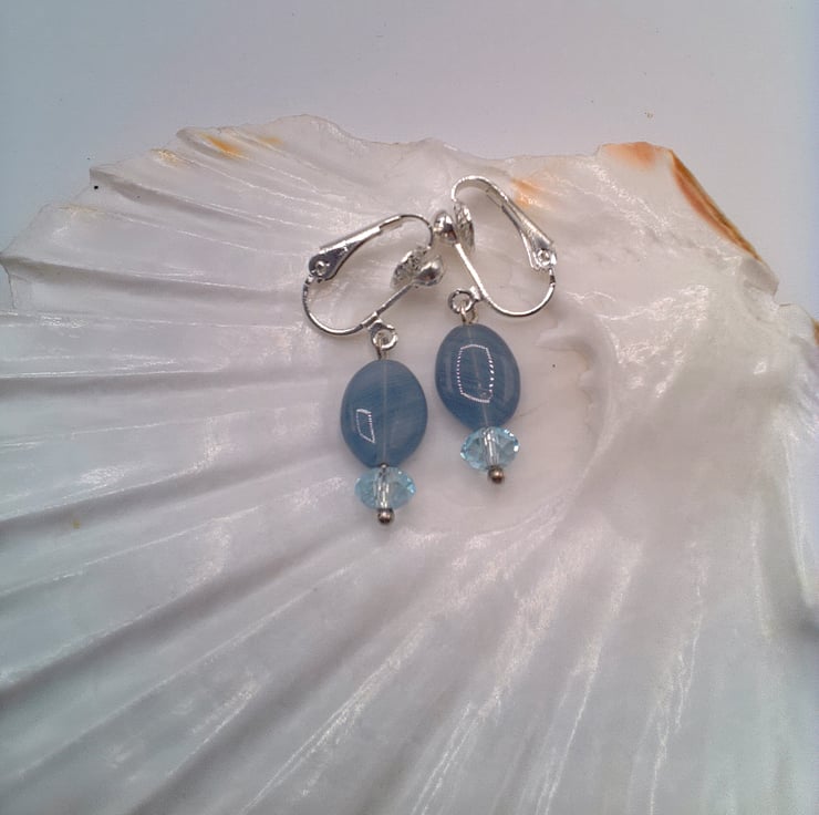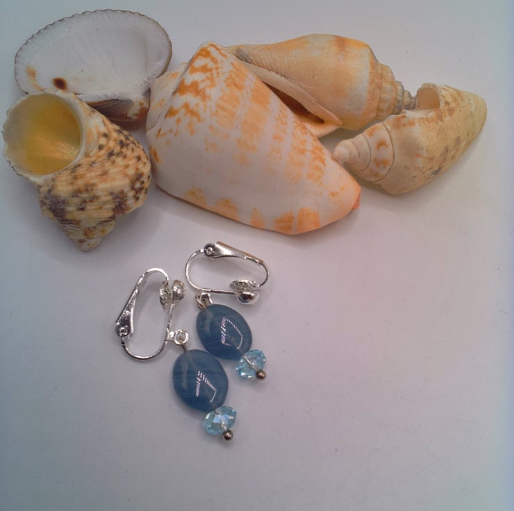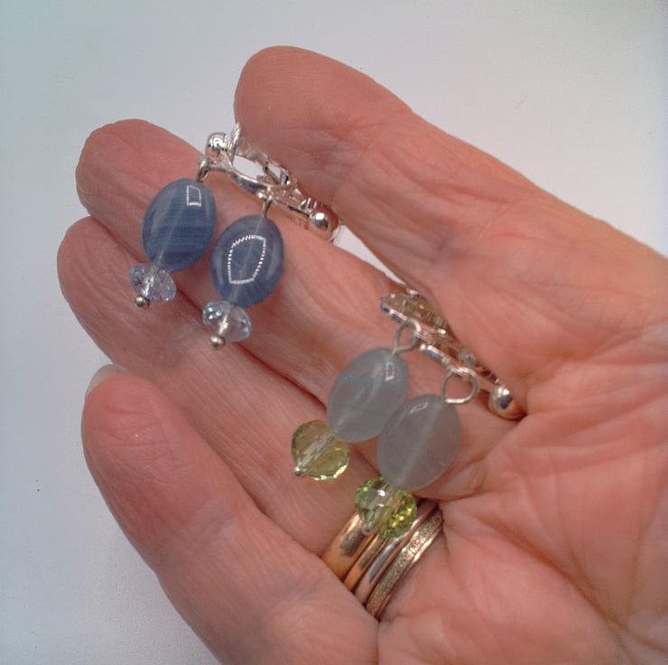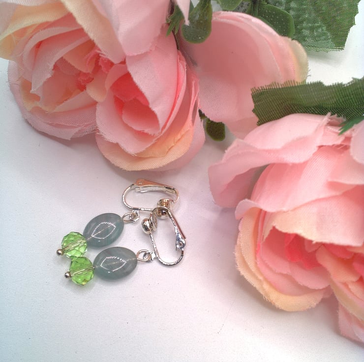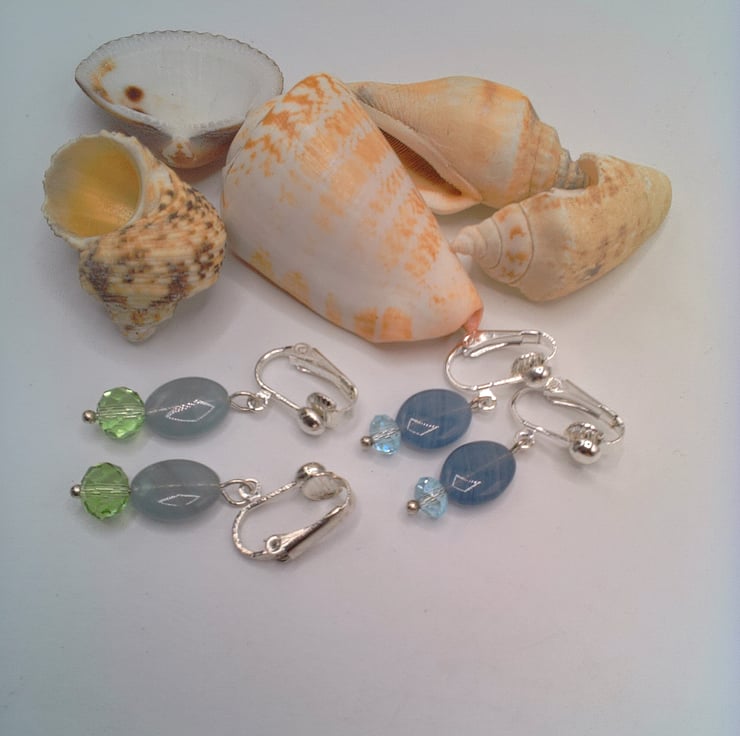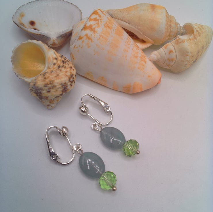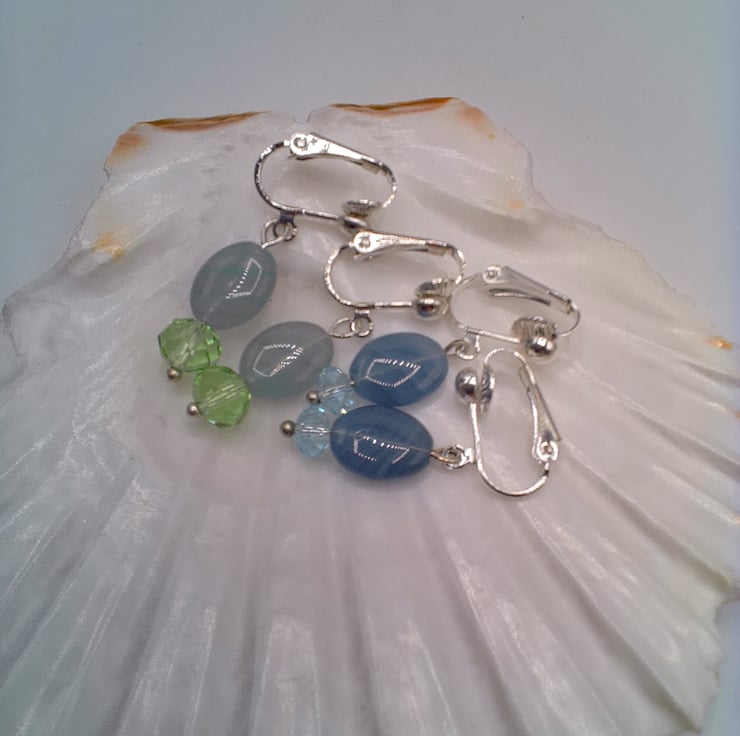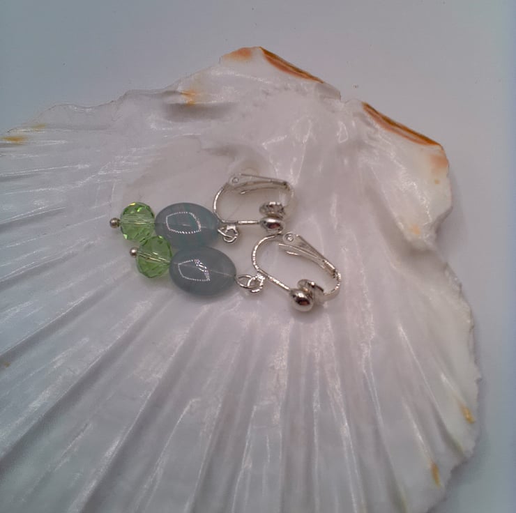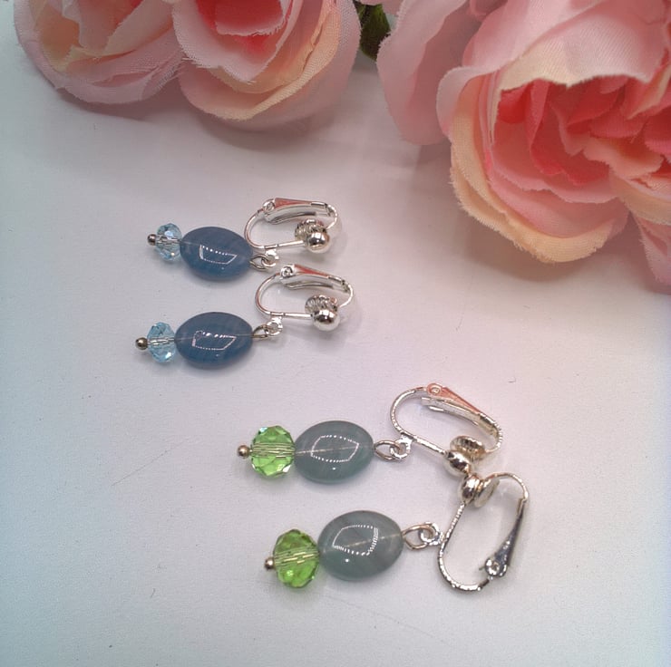 These pretty clip on earrings are designed for ladies who do not have pierced ears but who love wearing earrings. They would go well with any outfit you wear everyday or for a casual evening out. They would make the perfect gift for a friend or relative for a birthday or anniversary, or a treat for yourself. They are made using 12 mm x 10 mm green or blue opaline oval beads, with a 6 mm green or pale blue crystal rondelle bead. They are suspended on silver plated clip on ear backs with a drop of 3 cm from the base of the clip on backs. There are two pairs available, this listing is for one pair only.