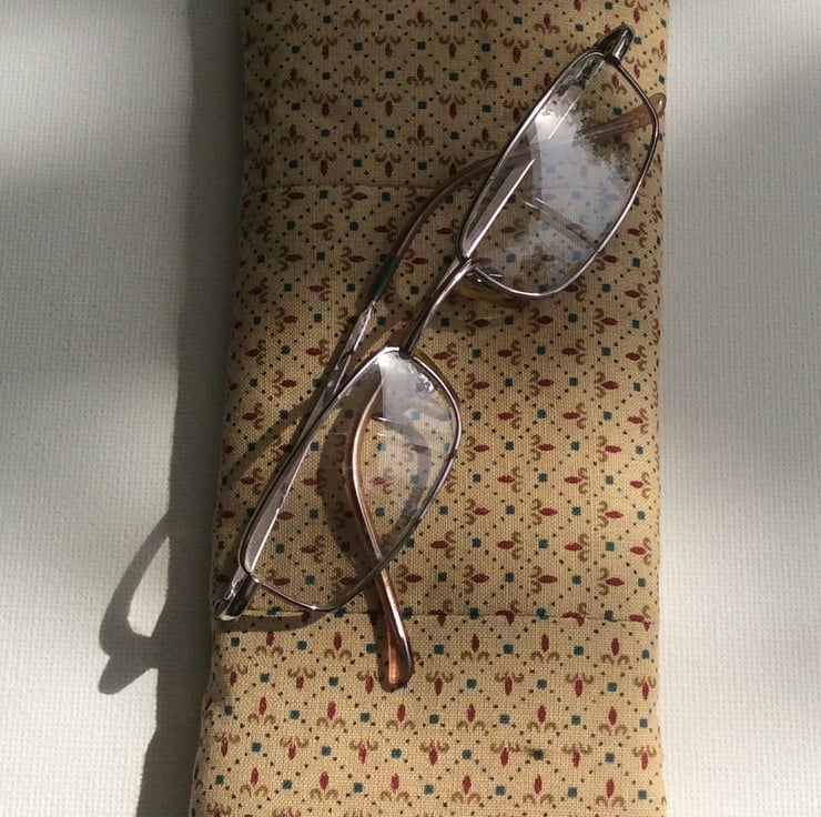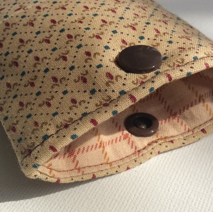 This stylish and elegant glasses case is made from a gold coloured, cotton fabric with a small pattern. The case has a brown, plastic press stud and is lightly padded and lined a matching, soft, brushed cotton fabric. (18cm x 8cm approximately)