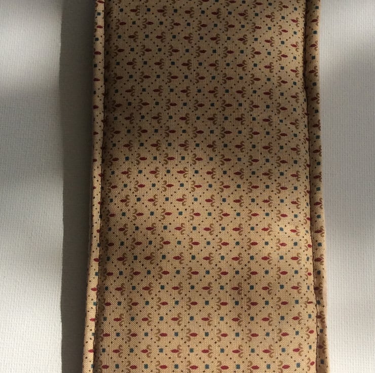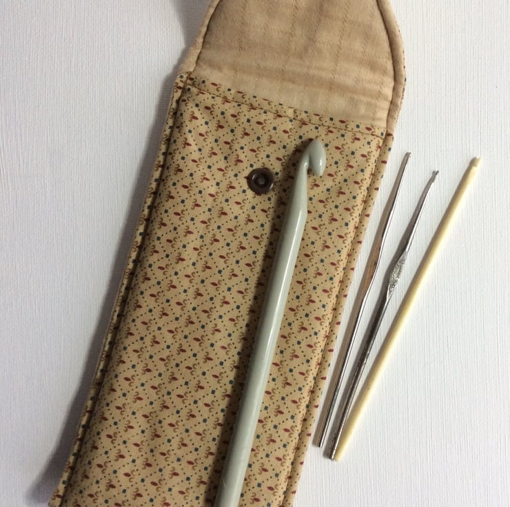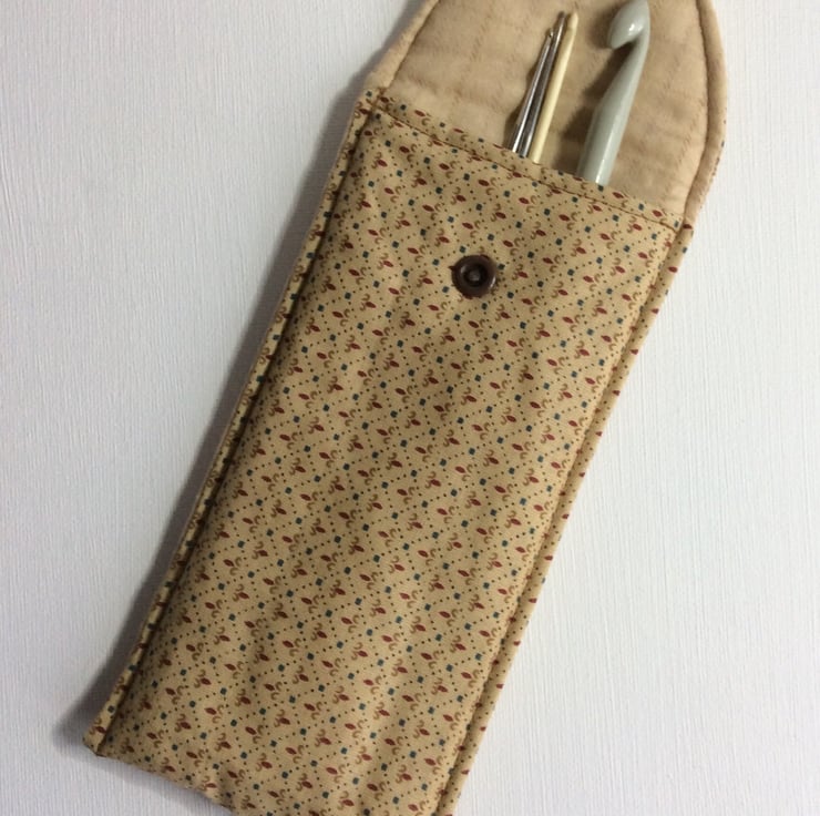 This practical crochet hook pouch or pencil case is made from a gold coloured, cotton fabric with a dainty pattern. The case has a brown, plastic press stud and is lightly padded and lined in a matching cotton fabric. (18.5cm x 8.5cm approximately).
