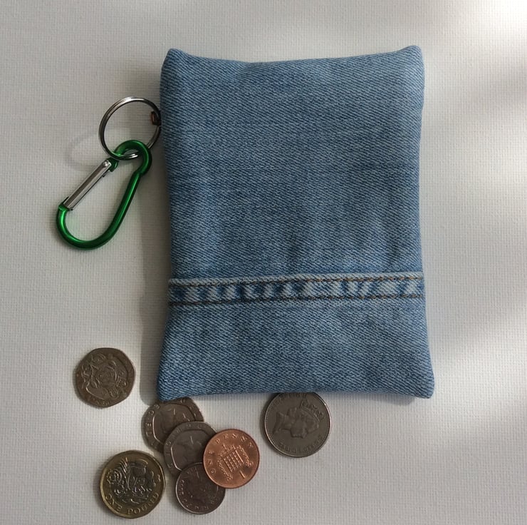 Zipped coin or credit card, key ring purse, light blue repurposed denim. The purse has a green carabiner attached to the zip pull with a split ring, ready for clipping to your belt or keys. It is lined with turquoise felt and measures approximately 9cm x 12cm.