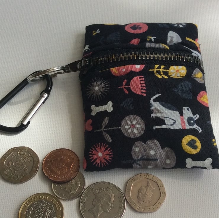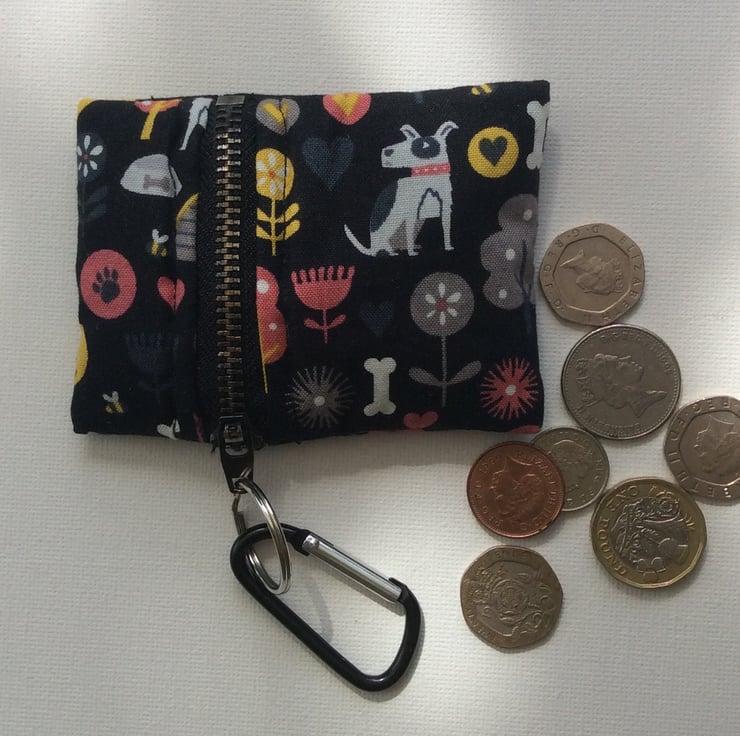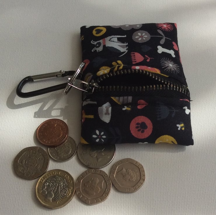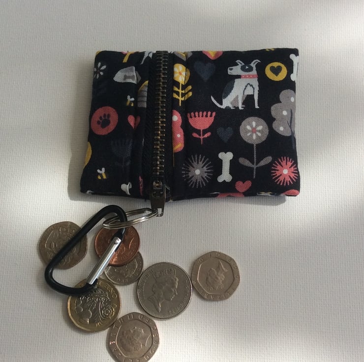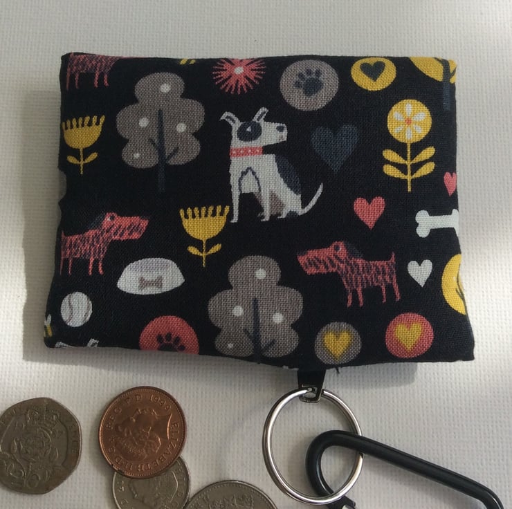 Zipped coin, key ring purse, black cotton with dogs, trees and flowers.The purse has a black carabiner attached to the zip pull with a split ring, ready for clipping to your belt or keys. It is lightly padded, lined with a plain black fabric and measures approximately 7cm x 10cm.