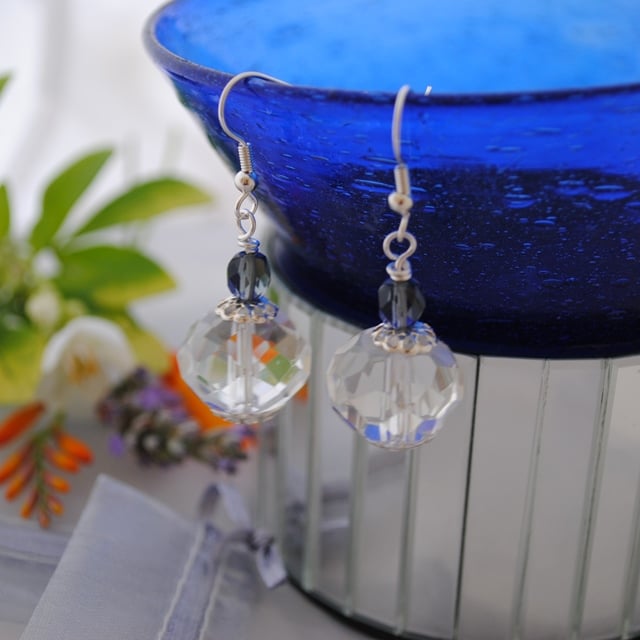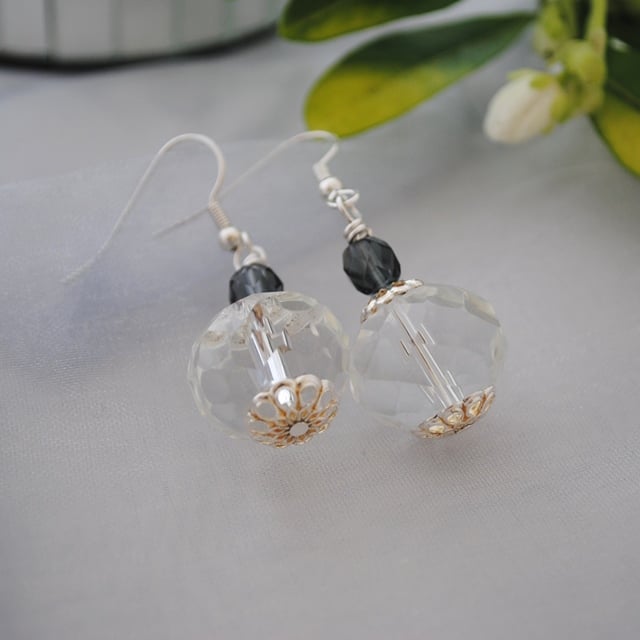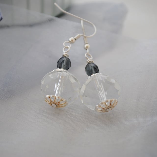 Super statement earrings made with crystals and black diamond beads. These earrings feature large clear crystal beads and black diamond (dark grey) fire-polished crystal beads. The beads hang from silver earrings and are decorated with antique silver bead caps.