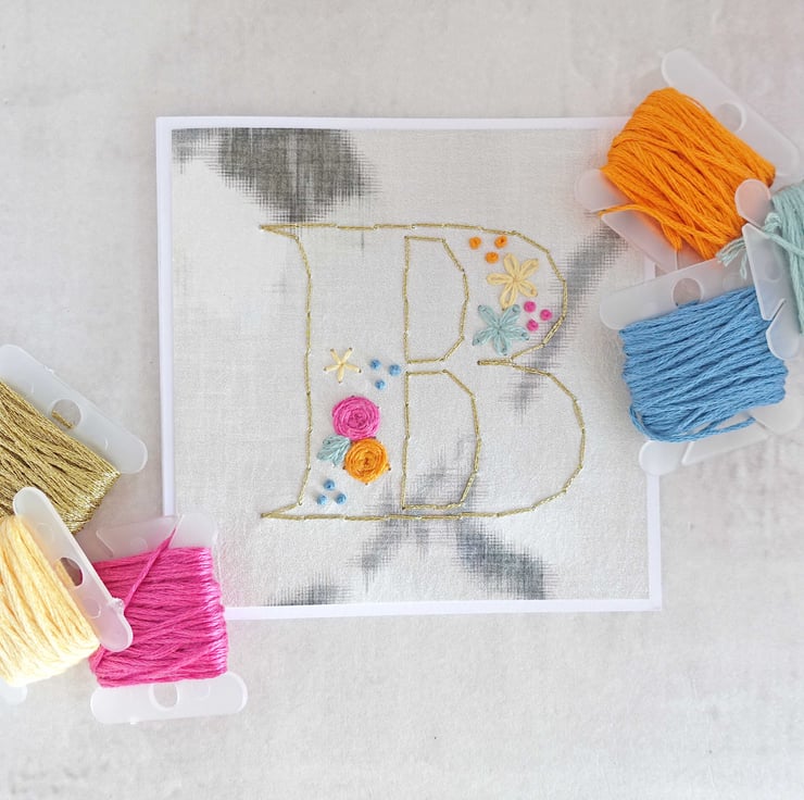 - Hand stitched with metallic thread for letter outline and filled with coloured cotton thread to give a tactile feel.