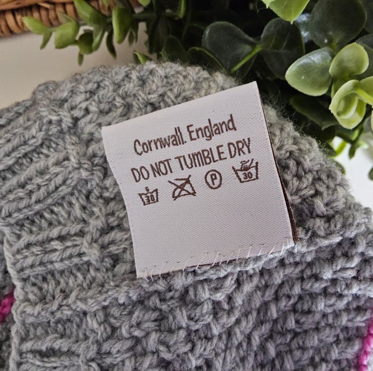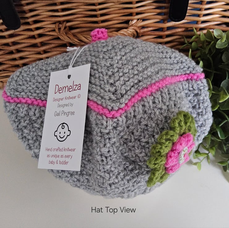 On the inside back seam the soft damask Demelza Designs garment label has been attached with the care instructions woven within it. On the hat top is the branded garment swing tag providing a professional finish if gifting.