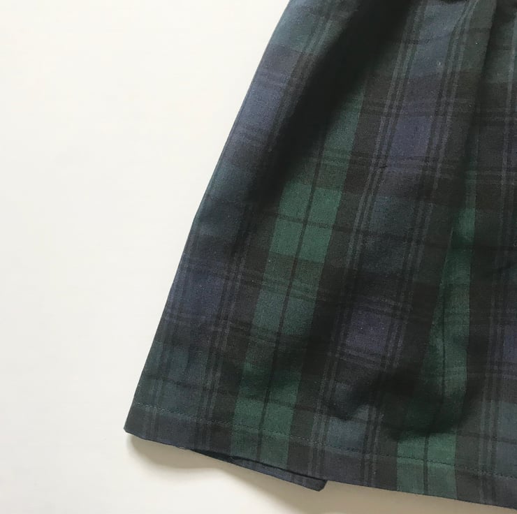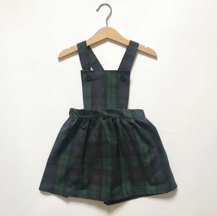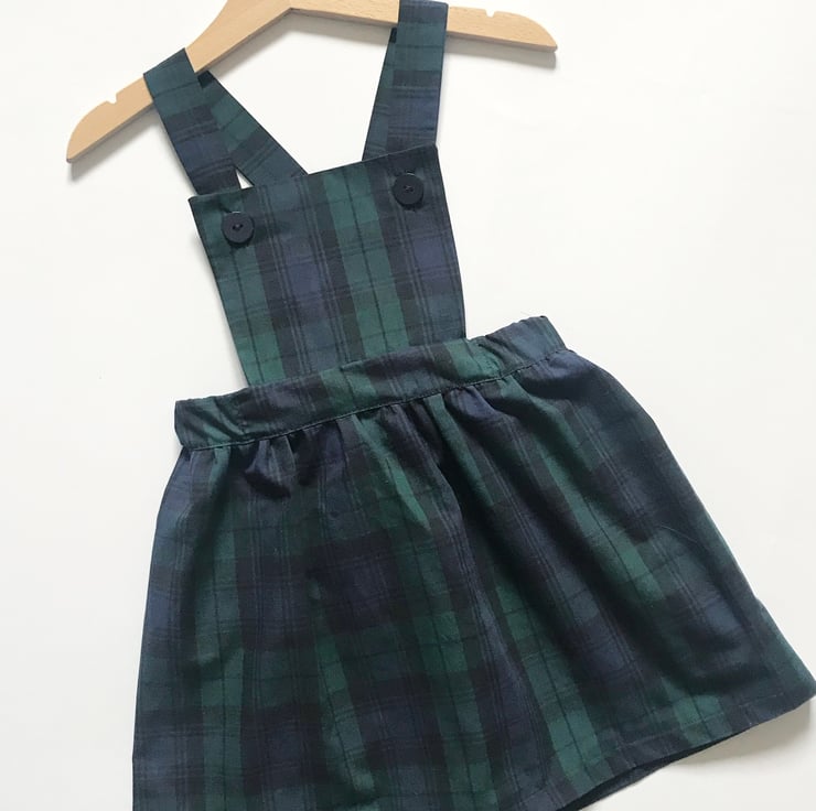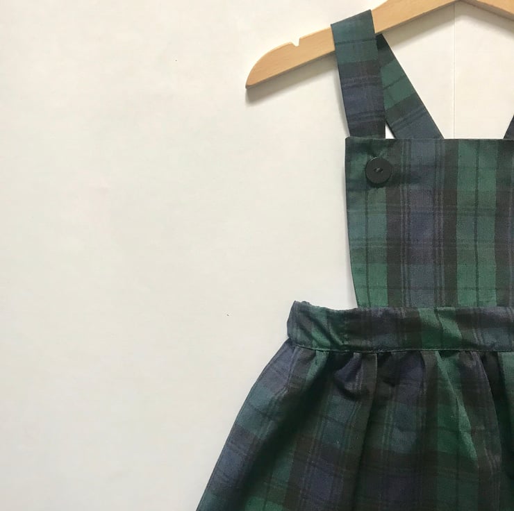 Handmade from green and navy blue tartan fabric in our traditional pinafore dress style.