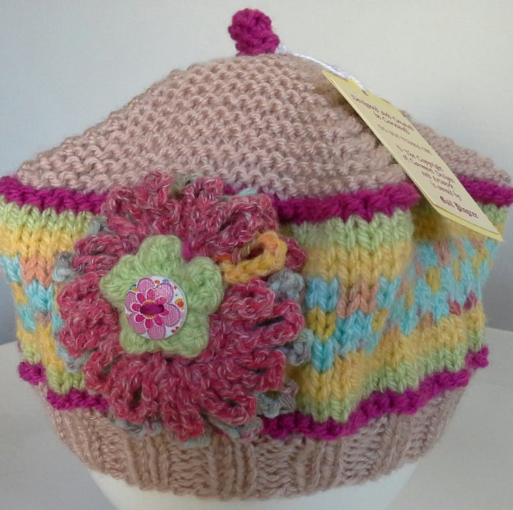 Designer Hand Knitted Baby Girl's Fairisle Beret Hat 12 - 18 months size