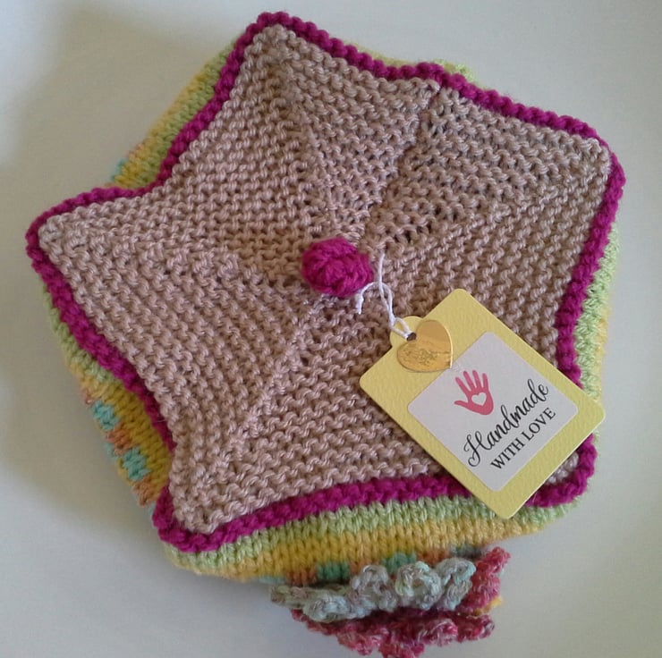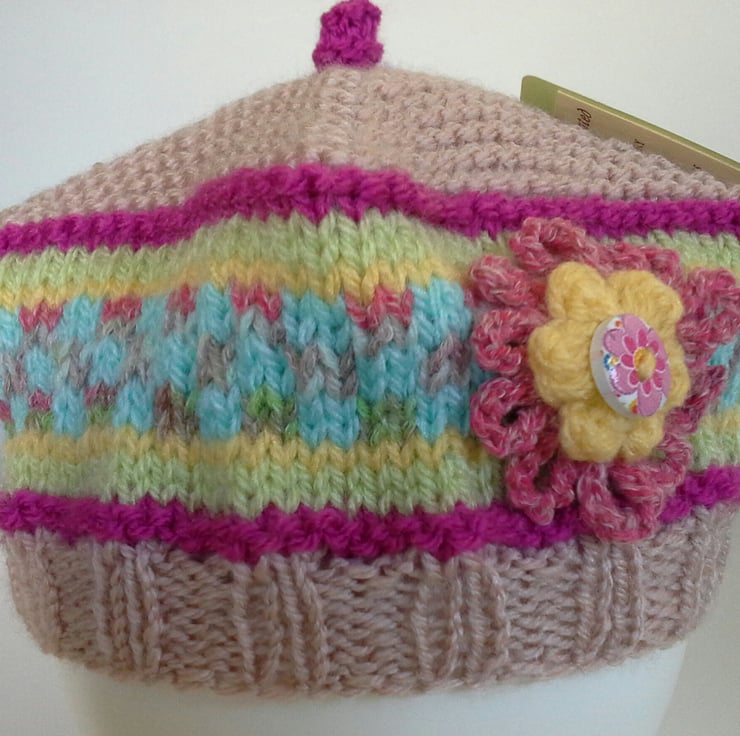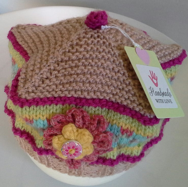A sweet unique baby girl's beret style hat designed and hand created by myself using quality branded British and French machine washable yarns. The hand crocheted flowers have a centre button made from genuine wood with a flower design on it.