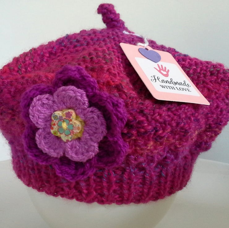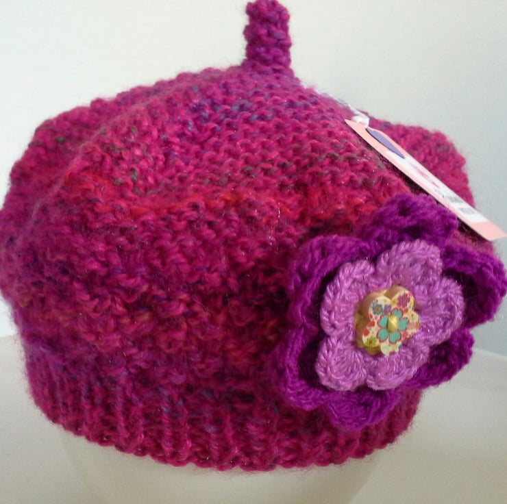 A very sweet eye catching girl's beret style flower hat designed and hand crafted by myself using quality British machine washable yarns with wool. The hand crocheted flowers have a button in the centre shaped as a flower made from genuine wood.