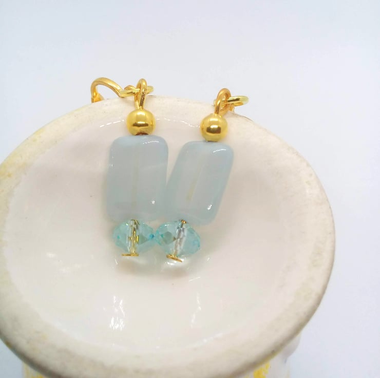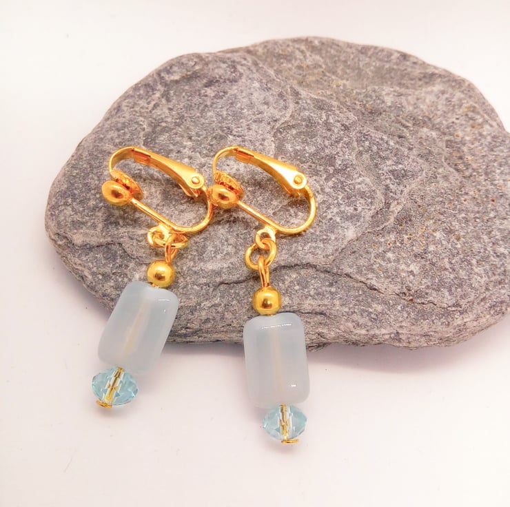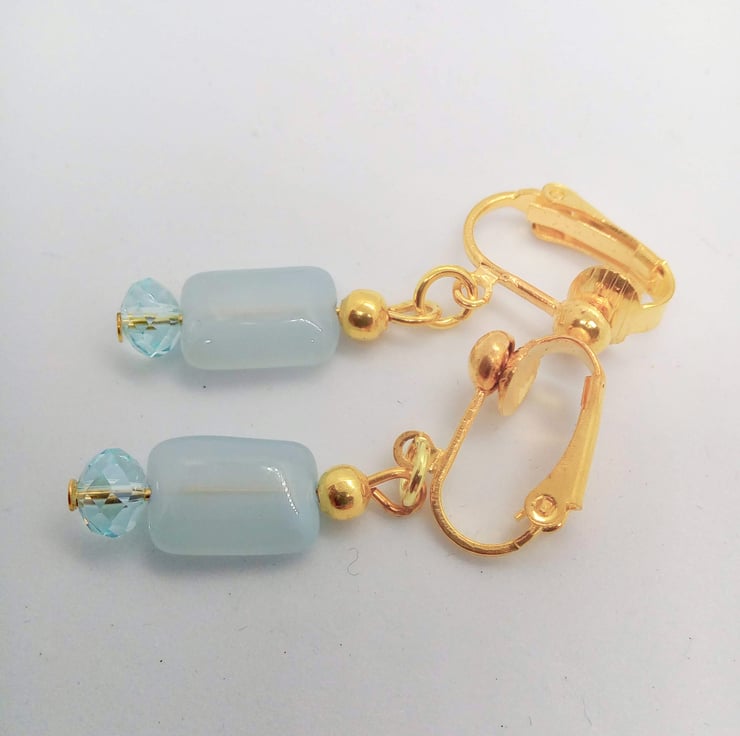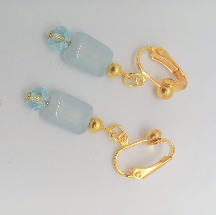 The earrings are made using 12 mm x 8 mm pale blue rectangular glass bead, with 2 x 6 mm blue crystal rondelle bead. They are hung on gold plated clip on ear backs and they have a drop of 3 cm.
