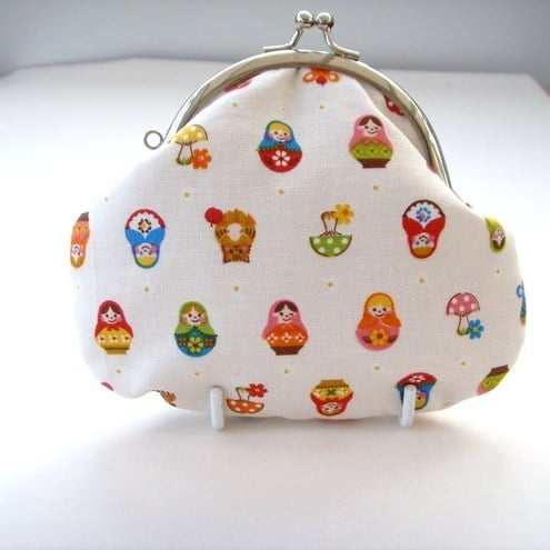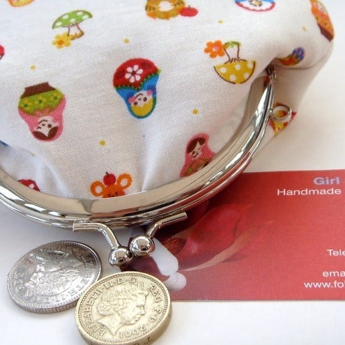 Perfect little purse for your keys, change and credit cards.Little Russian dolls fabric with contrasting lining, padding and metal frame clasp.