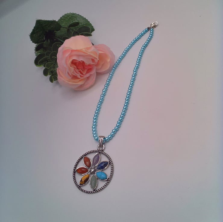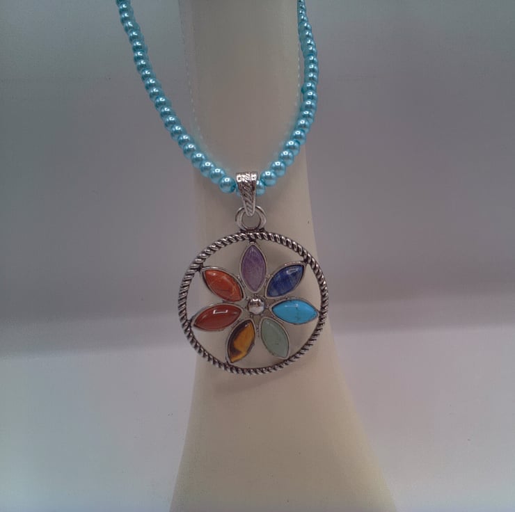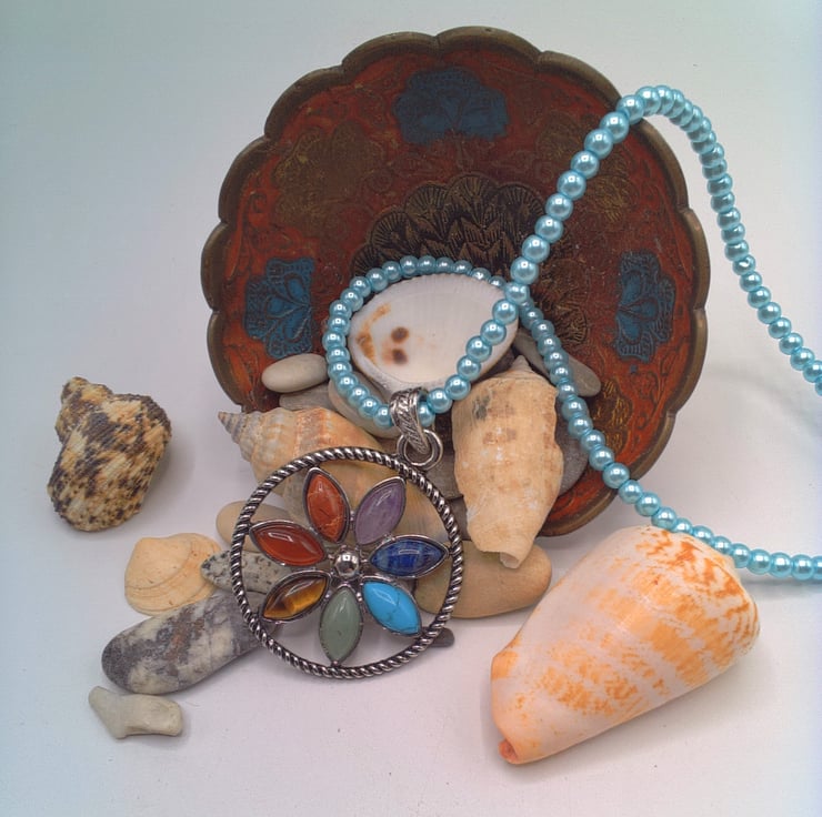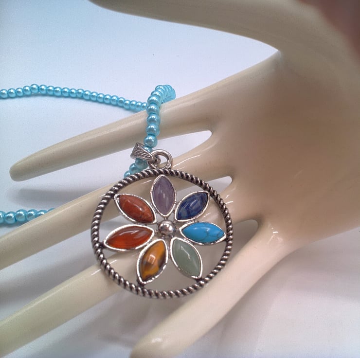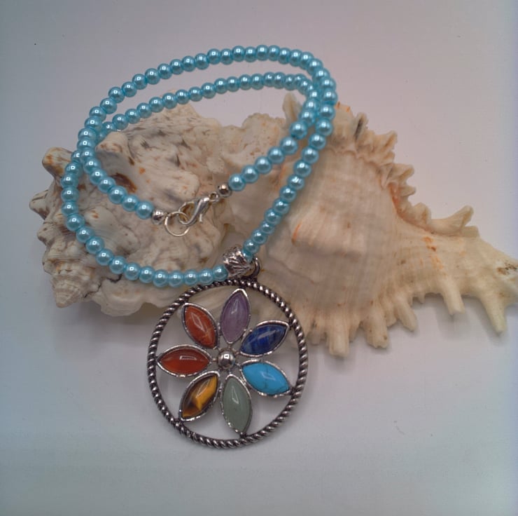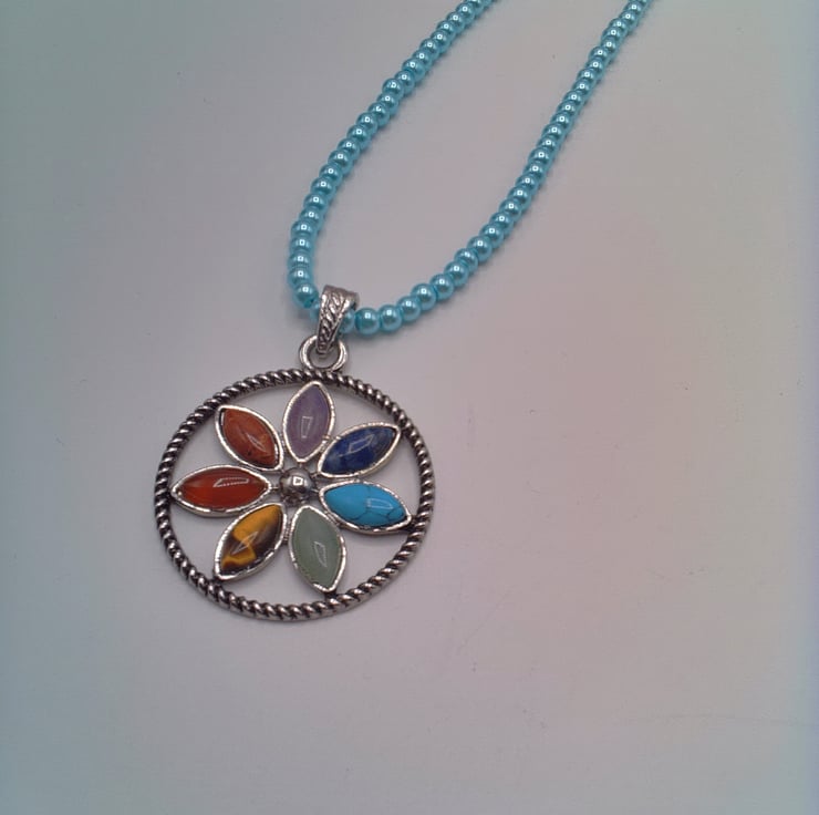 A silver plated Round Chakra floral pendant with semi precious stones on a pale blue pearl choker necklace. It would look great with your Spring and Summer outfits. It would also make a great gift idea for a fun loving lady, or a treat for yourself. The beads for the necklace are 4 mm pale blue pearl beads and the semi precious stones are Garnet, Turquoise, Lapis Lazuli, Amethyst, Tiger's Eye, Green Aventurine and Carnelian. The pendant is 40 mm in diameter and each of the oval semi precious stones which make up the flower petals are 12 mm x 8 mm. The silver plated pendant is suspended from a silver plated bail and the necklace has a silver plated lobster clasp. The overall length is 14 inches (36 cm). The pendant will be dispatched wrapped in tissue paper in an organza bag and delivered to you via Royal Mail first class post.