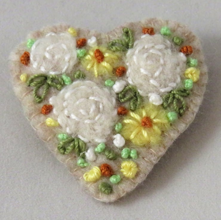 White roses and yellow dahlias have been felted onto a beige, heart-shaped, felt background. The design has been completed by simple hand embroidery in cotton threads and is embellished with French knots.