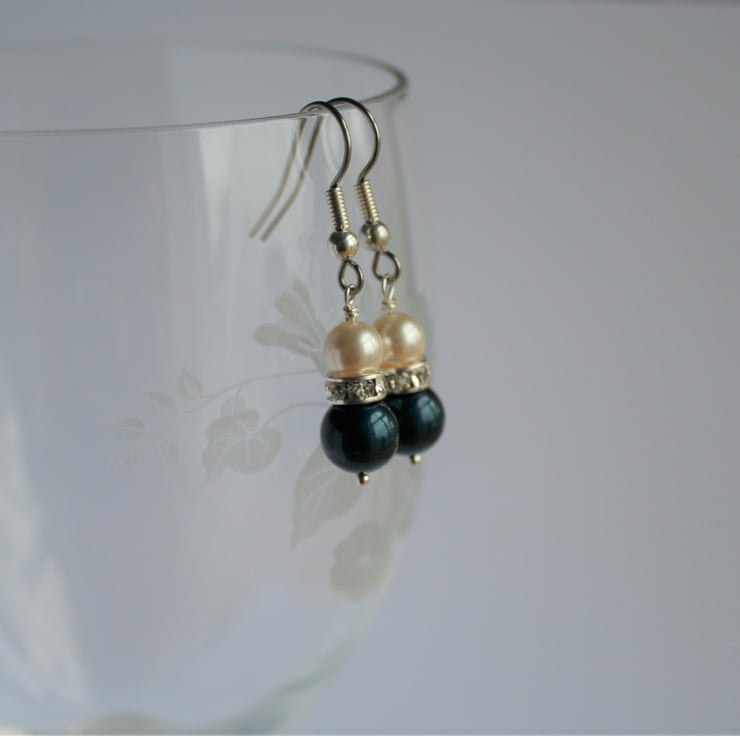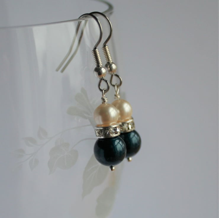 These earrings are made with Swarovski crystals and pearls layered together on sterling silver wire. The largest crystal pearl is a beautiful deep peacock blue and above that the smallest pearl is a warm cream colour. The swarovski pearls are separated by a rondelle of clear crystal which will catch the light as they dangle and move.