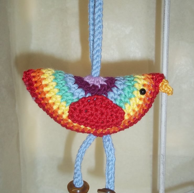 Made from crochet cottons his colourful stripy pattern and quaint button feet on dangly legs will make a fun decoration where ever he is put, choose him as a gift for brighten someone’s day. He's lightly stuffed and lovely and soft with cute beady eyes. Approximate size of body four and a quarter inches by two inches (11cm by 5cm) including hanging loop and legs six and a half inches (17cm) Item is designed as a decoration not a toy.