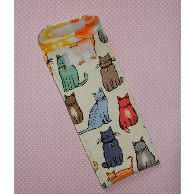 This would be a great gift for a cat lover, it is a handy case for your glasses or sunglasses, which is made from a beautiful fabric featuring colourful cats. It has a print lining, and a layer of wadding for protection. The case fastens with Velcro. Perfect for glasses or sunglasses.