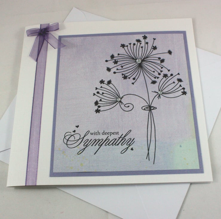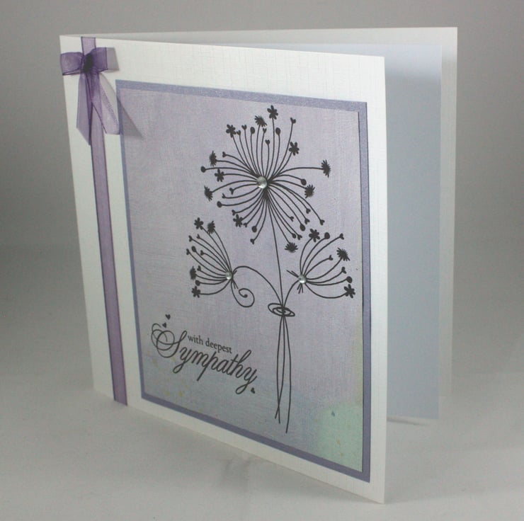 Square linen sympathy card with an image of dandelion heads printed over a multicoloured pastel background, together with the sentiment 'with deepest sympathy'.