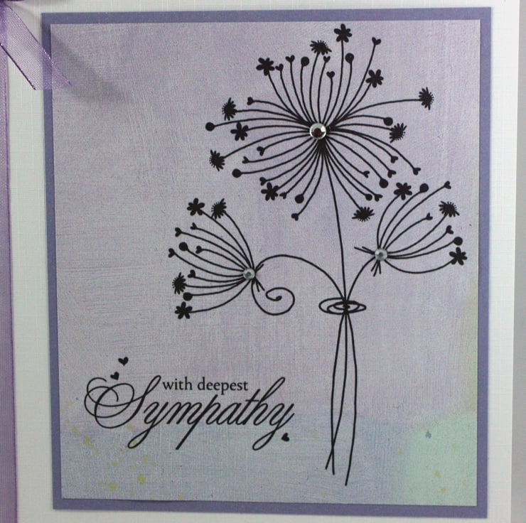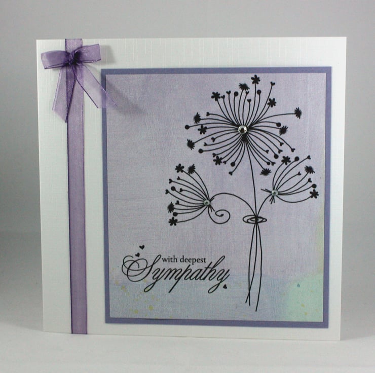 The centres of the flowers have small gems and the card is finished with a pale purple organza ribbon and bow.