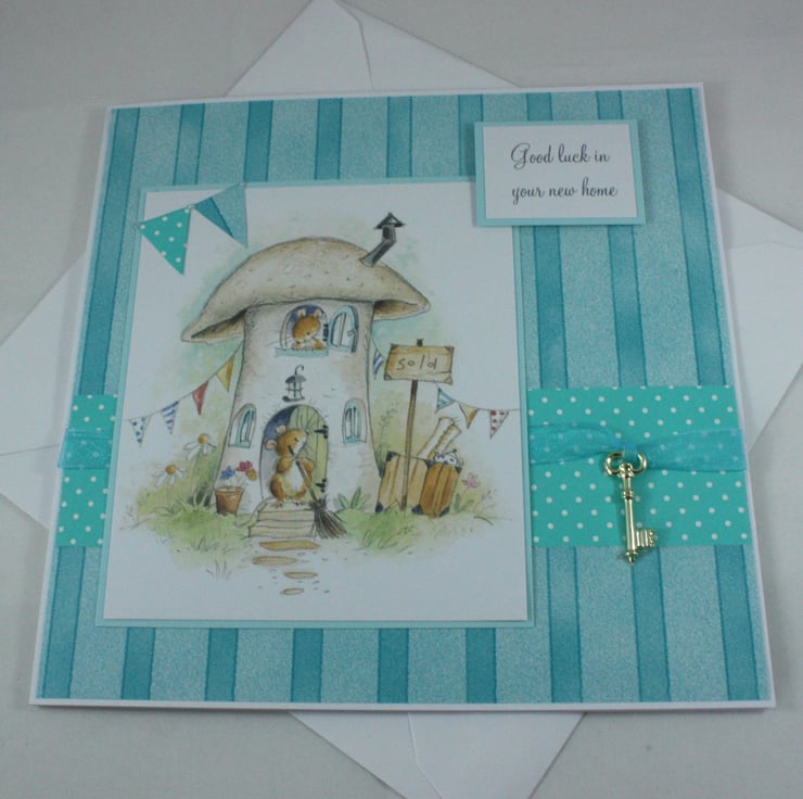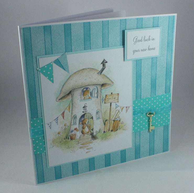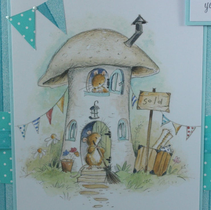 Large square new home card. It features a cute image of two mice moving into their new toadstool home, with some coordinating bunting across one corner.