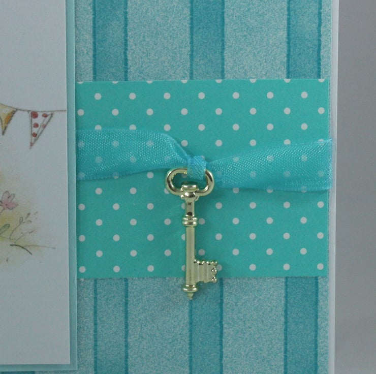 The image is overlaid on a turquoise striped background with a panel of polka dot card. The card is embellished with a small gold coloured key on a piece of organza ribbon.