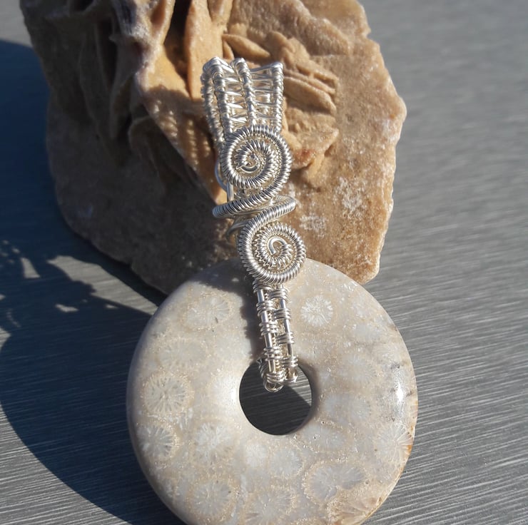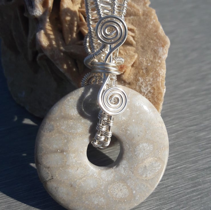 This unusual donut is a neutral colour and wire wrapped with silver plated copper wire (with hypoallergenic coating). It is fossil agate, also known as Chrysanthemum stone, and is fossilised coral. There is a different design on each side, in case you fancy a change. The donut is 4cm or 1.5in in diameter and the total length with the bale is just over 6.5cm or 2.5in. It comes with a free leather thong, 19in with 2in extender. The bale is generous enough for a viking knit chain, which will be listed separately. It also looks great on the collars, listed separately.