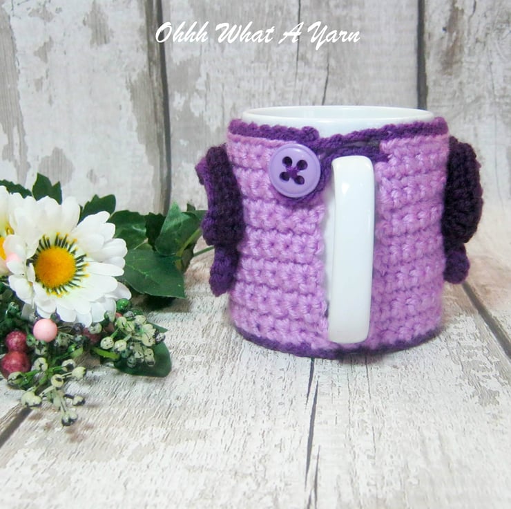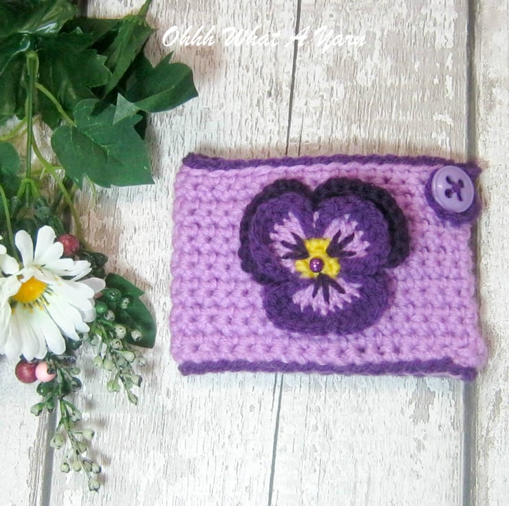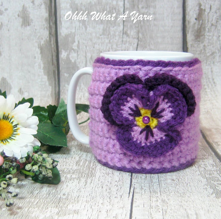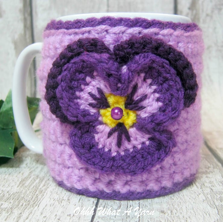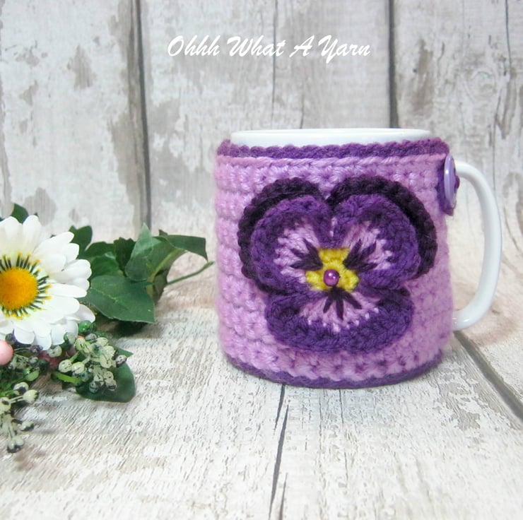 This beautiful purple and lilac pansy mug hug is crocheted using 100% acrylic yarn.
