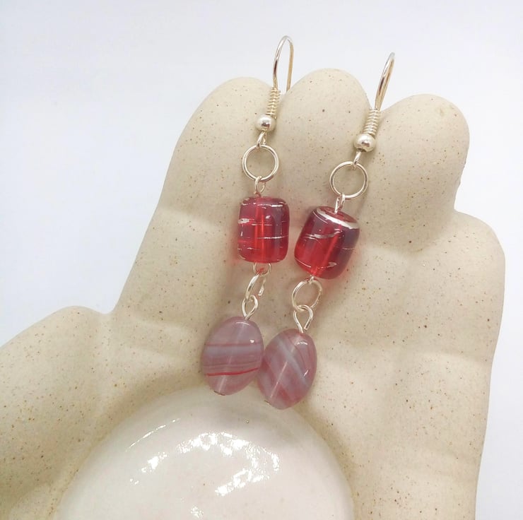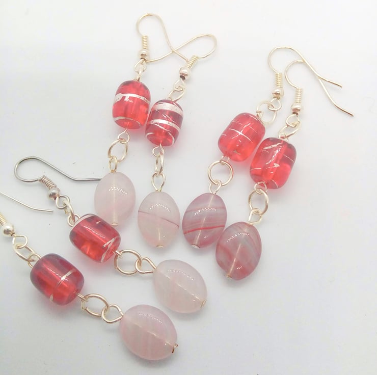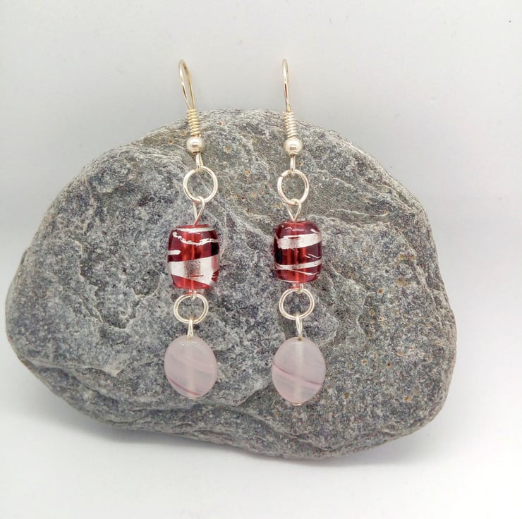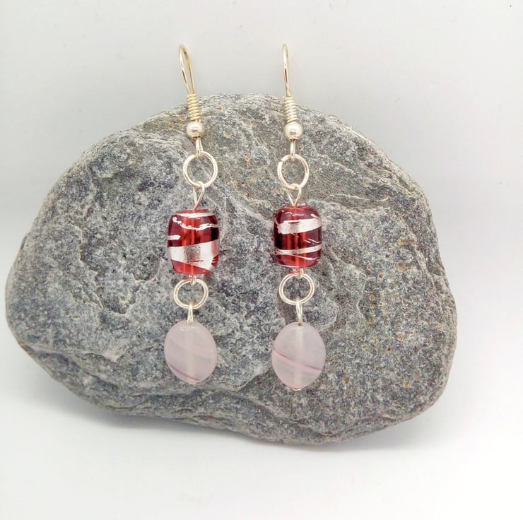 The earrings are made using 12 mm x 10 mm pink opaline oval beads, with blue and dark pink patterns, and 10 mm x 10 mm red tube beads joined together with a silver plated ring. They are hung on silver plated ear hooks and they have a drop of 4 cm.