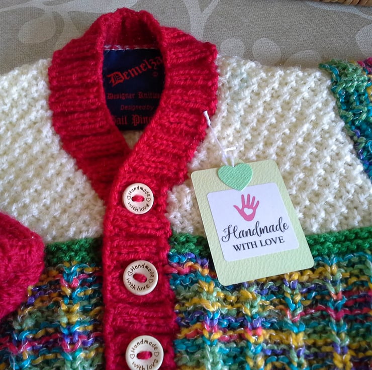 A very eye catching unique baby cardigan designed and hand crafted using quality branded British and Turkish machine washable yarns. This adorable super soft garment would make a perfect next size up newborn or baby shower gift any mother would love to receive for her baby. The buttons are made from genuine wood with a burnt etched sentiment on them.
