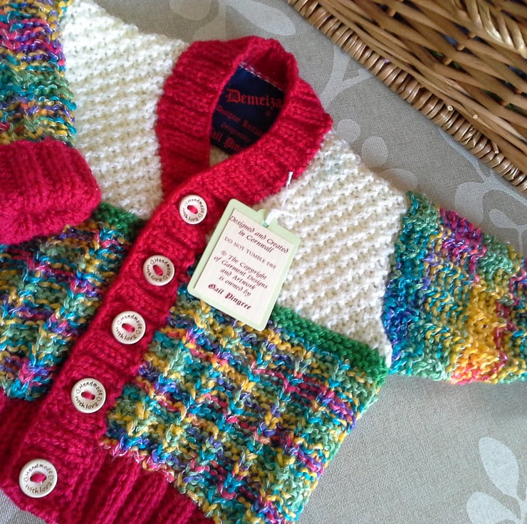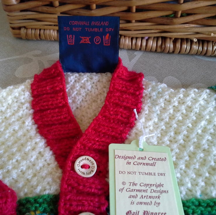 Baby knitwear is designed and hand crafted by Demelza Designs in Cornwall meeting UK baby safety standards, Only branded premuim acylic, acrylic/natural fibre blends or pure natural fibre yarns are used in baby knitwear which conforms to BS984/76 standards.