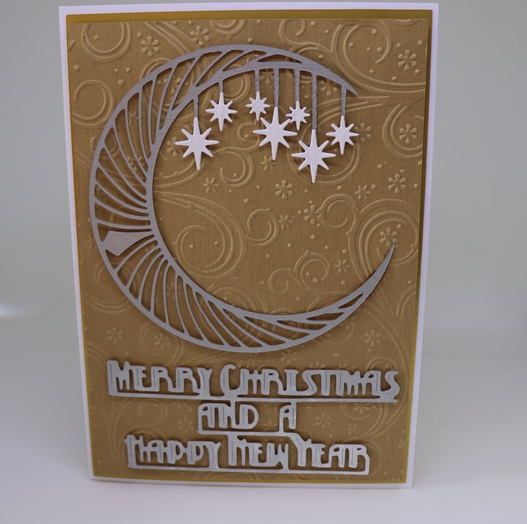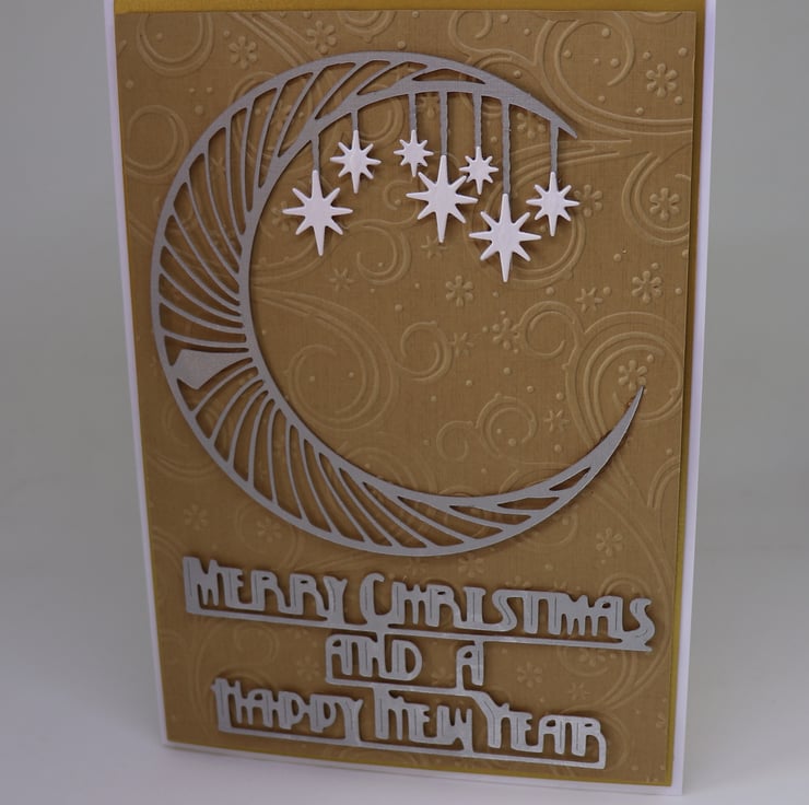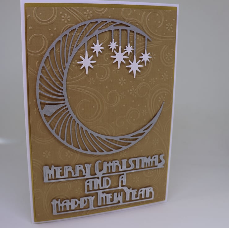 The Matt and Layer is a gold card topped with a Mid Brown card I have Embossed with a Swirl of snow flakes, on this I have topped with a Art Deco Moon coloured with a rich Silver ink and I have Embossed Christmas Stars in Pearl white card, the sentiment is merry Christmas and a happy new year in rich silver ink as well.