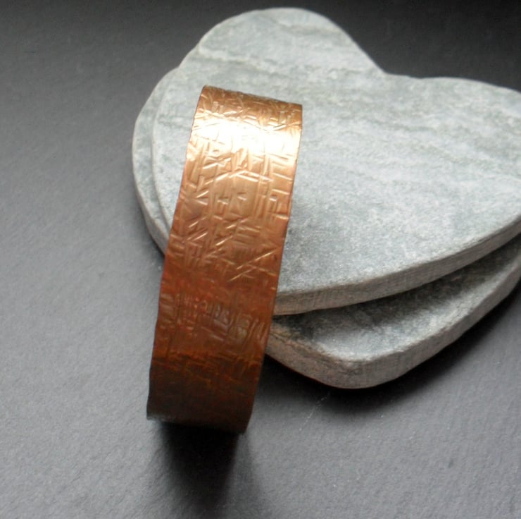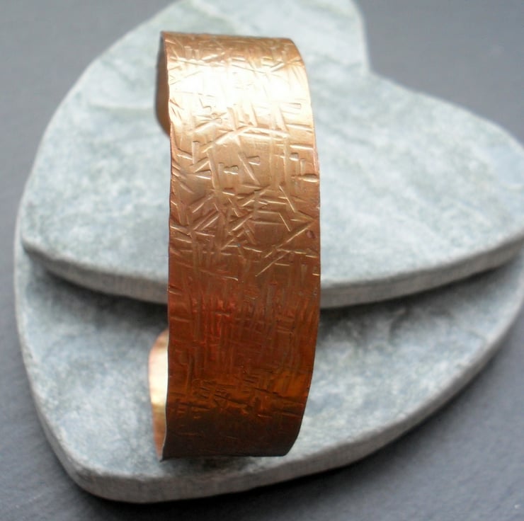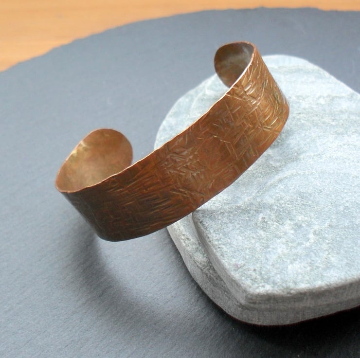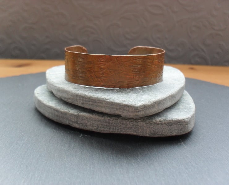 Copper cuff bracelet which has been hand cut from a sheet of copper, hammered to give texture,sanded and oxidised to give a slight aged look. The bracelet has then had a lacquer coating to protect the patina