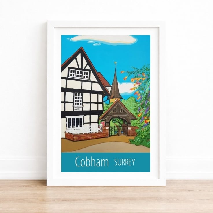 A contemporary travel poster style print of Stile House and St Andrew's Church in Cobham, Surrey, from my own original acrylic painting. A perfect gift for those who love Cobham!
