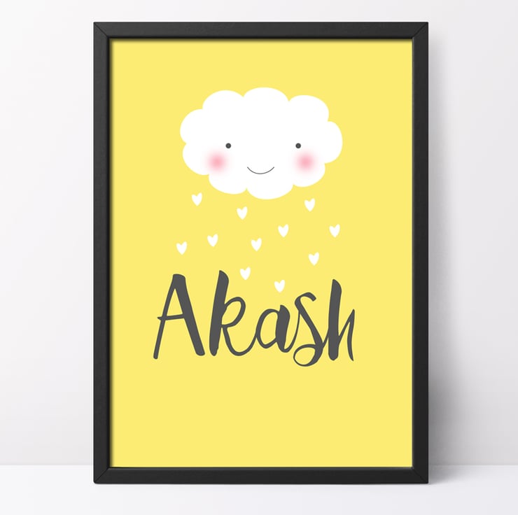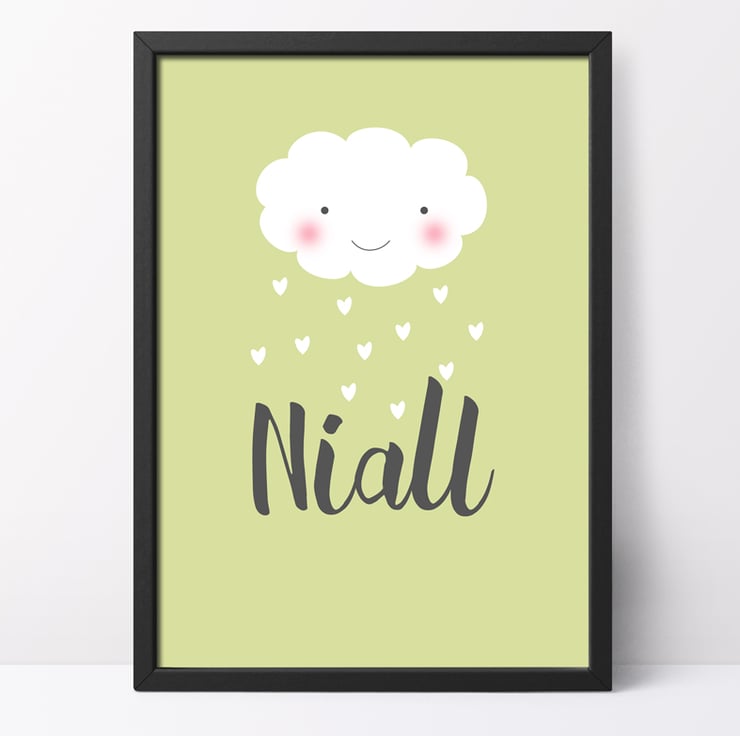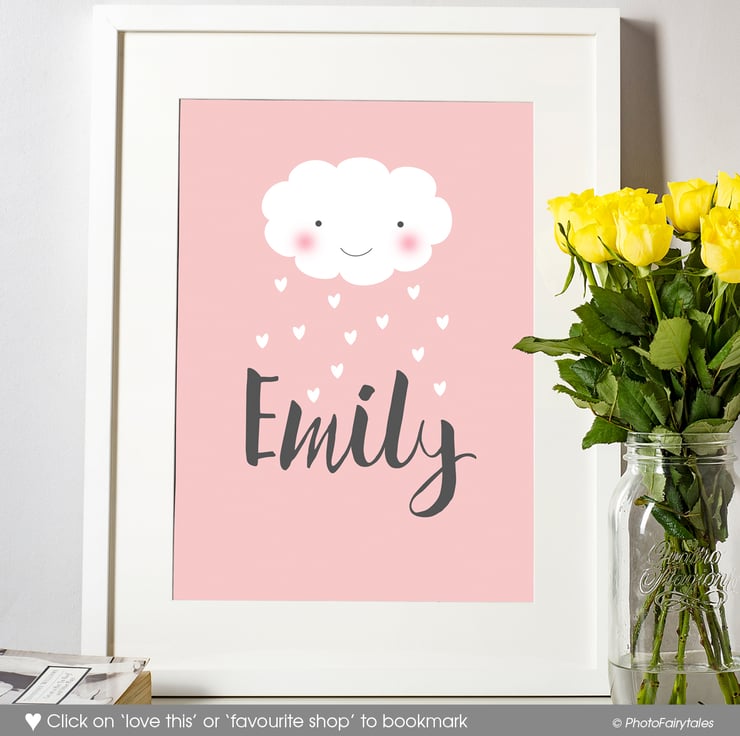 Featuring a cute kawaii style happy, smiling cloud raining hearts and love over your chosen name. The print is a generous A3 size and will make a really eyecatching piece on the wall.