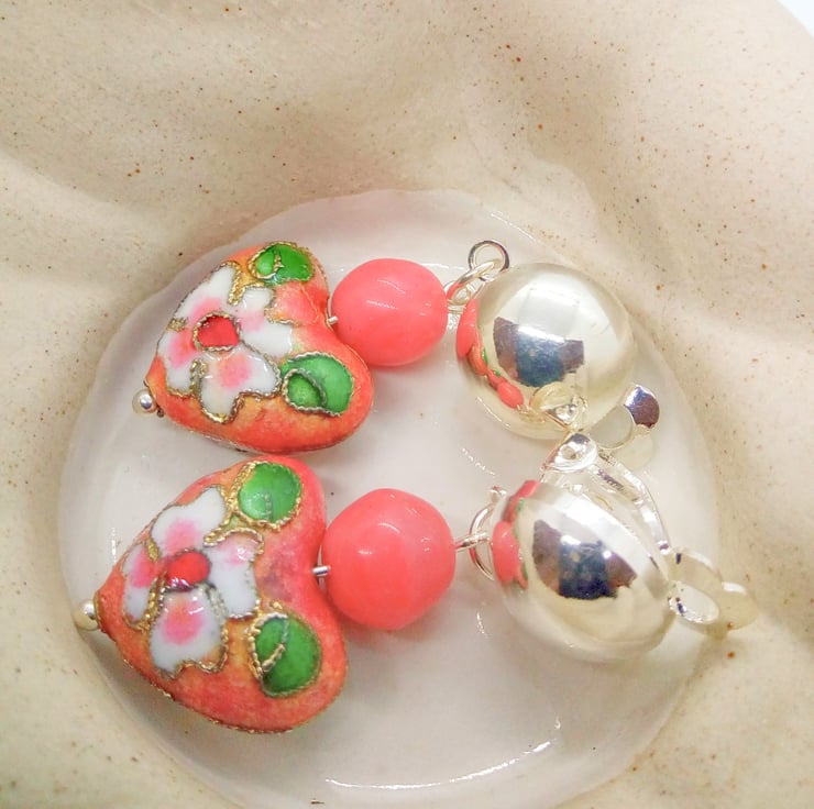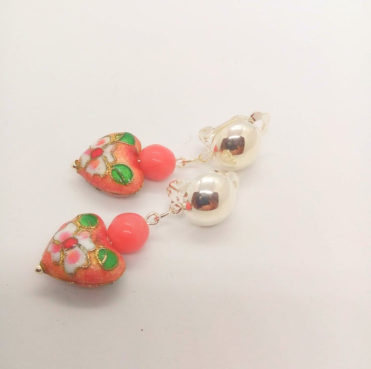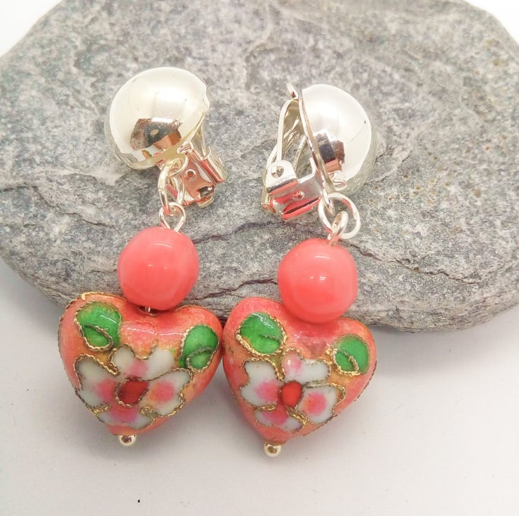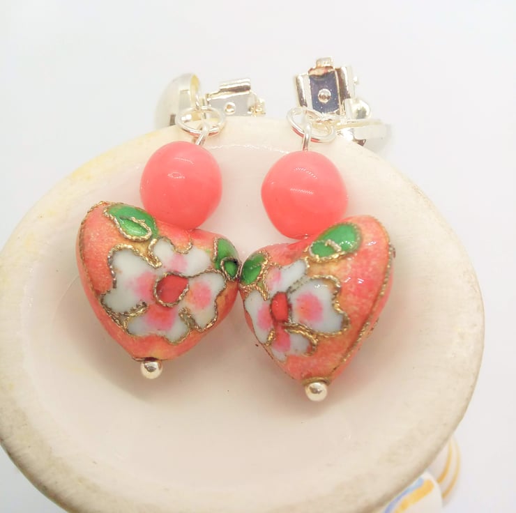 The earrings are made using 20 mm x 15 mm heart shaped coral pink cloisonne bead with a floral pattern and an 8 mm round pink bead. They are hung on silver plated domed clip on ear backs and they have a drop of 3 cm.