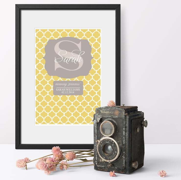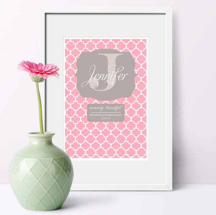 This contemporary Preppy style print is a lovely personalised gift to mark the arrival of a new baby. Featuring a personalised monogram, your baby’s name and date of birth, the print also features the meaning of their name too.