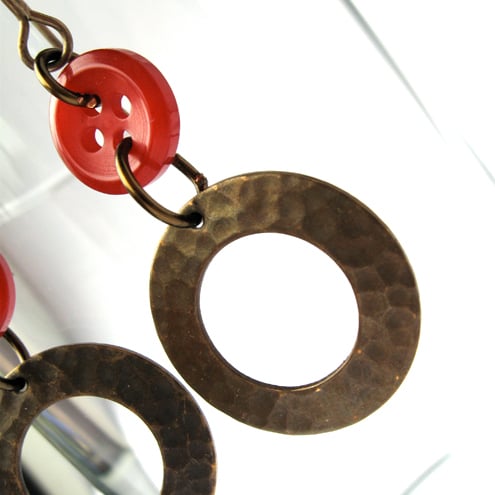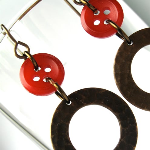 Handmade earrings with pure brass rings, and tiny red salvaged vintage buttons.