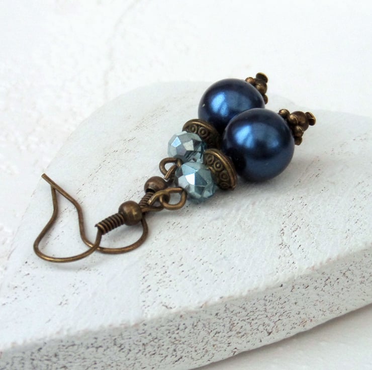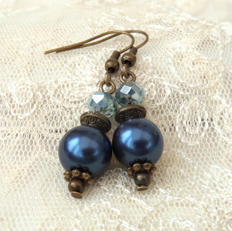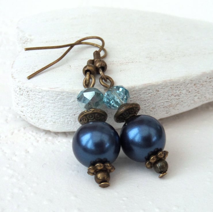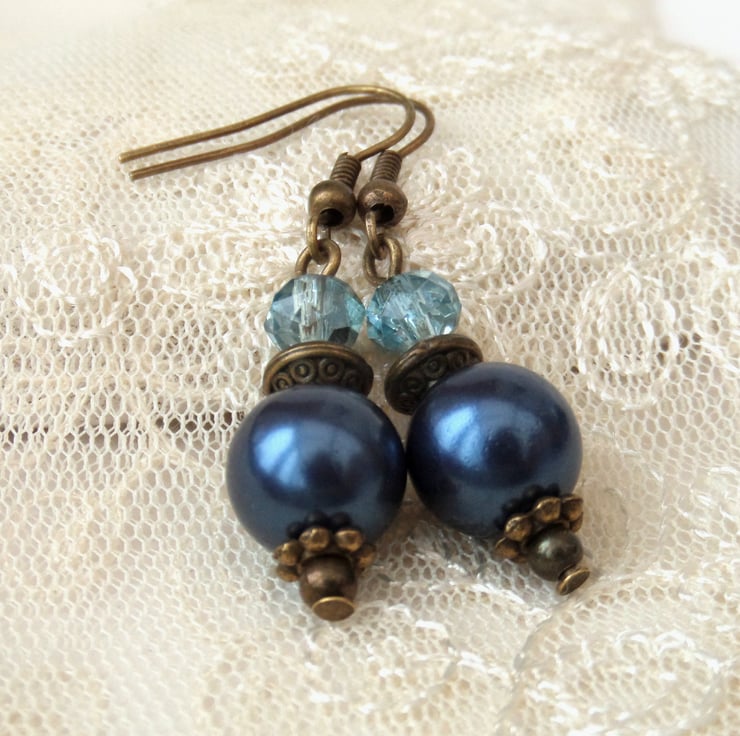 Stunning midnight blue shell and aqua crystals hang from bronze wires with bronze beads to make these vintage-style earrings.