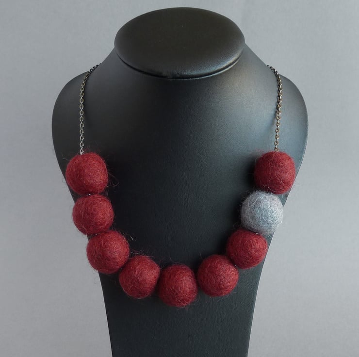 The light-weight, felted balls measure 2cm in diameter and are finished with sections of gunmetal trace chain and a gunmetal lobster clasp. This dark red felt necklace measures 23.5 inches in length, but can be lengthened or shortened to customer requirements - just leave me a note of your required length in the notes section during check out.
