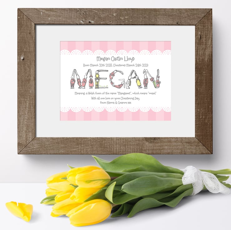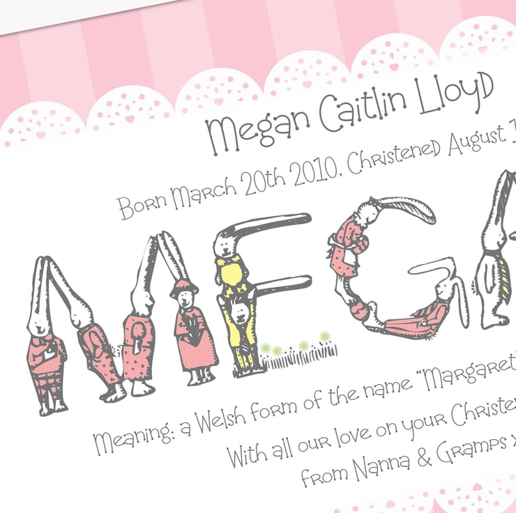 Each letter of your baby’s name is spelled out in adorable little rabbits – a sweet personalised keepsake idea to celebrate your newborn, and a wonderful gift for a christening, baptism, or birthday.