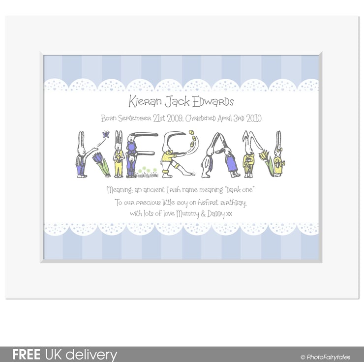 This sweet personalised bunny print will look gorgeous in your baby’s nursery or on your little boy or girl’s bedroom wall. Available in pink or blue. As well as the meaning of your baby’s first name, the print also features your baby’s date of birth, christening or naming ceremony, and a personal message too.
