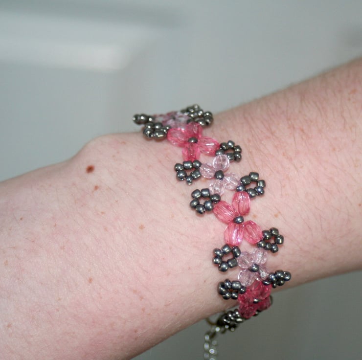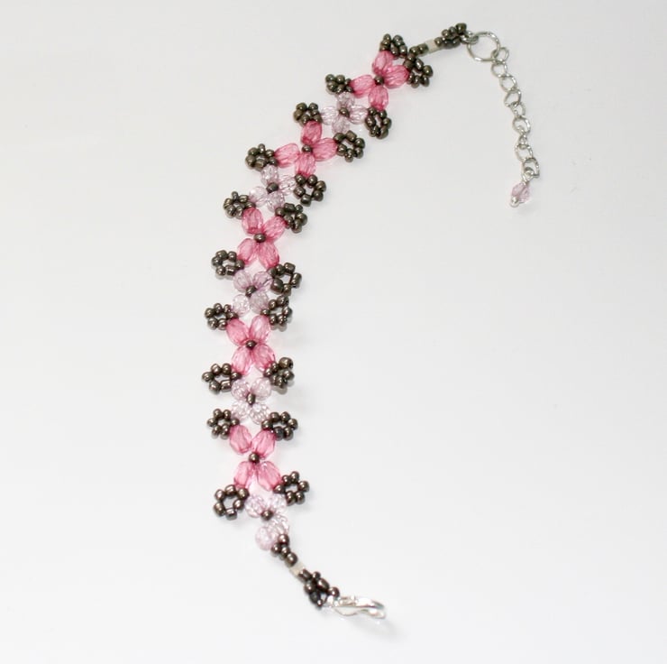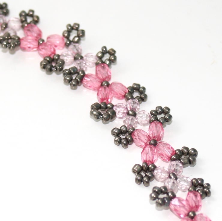 A delicate bracelet that has been woven with grey seed beads and light and dark pink crystal beads.