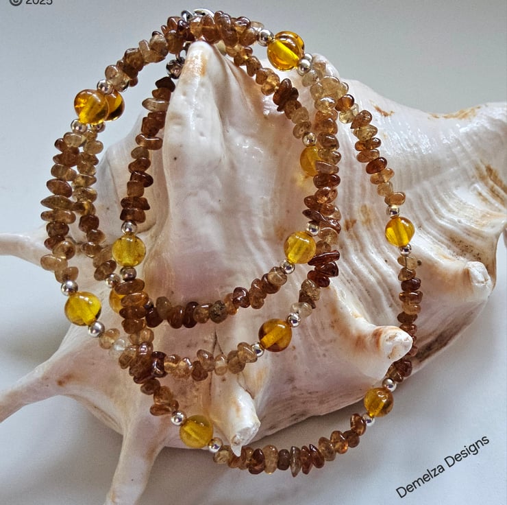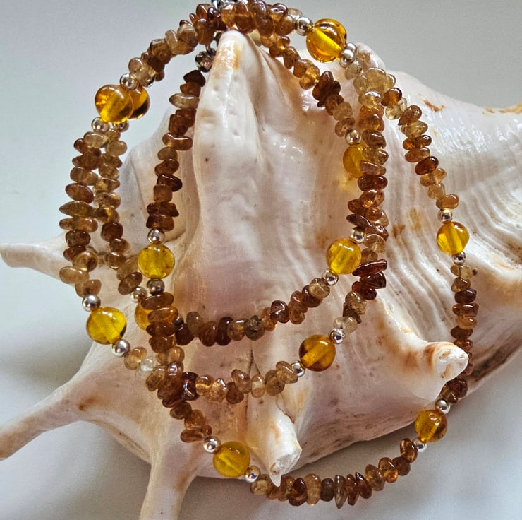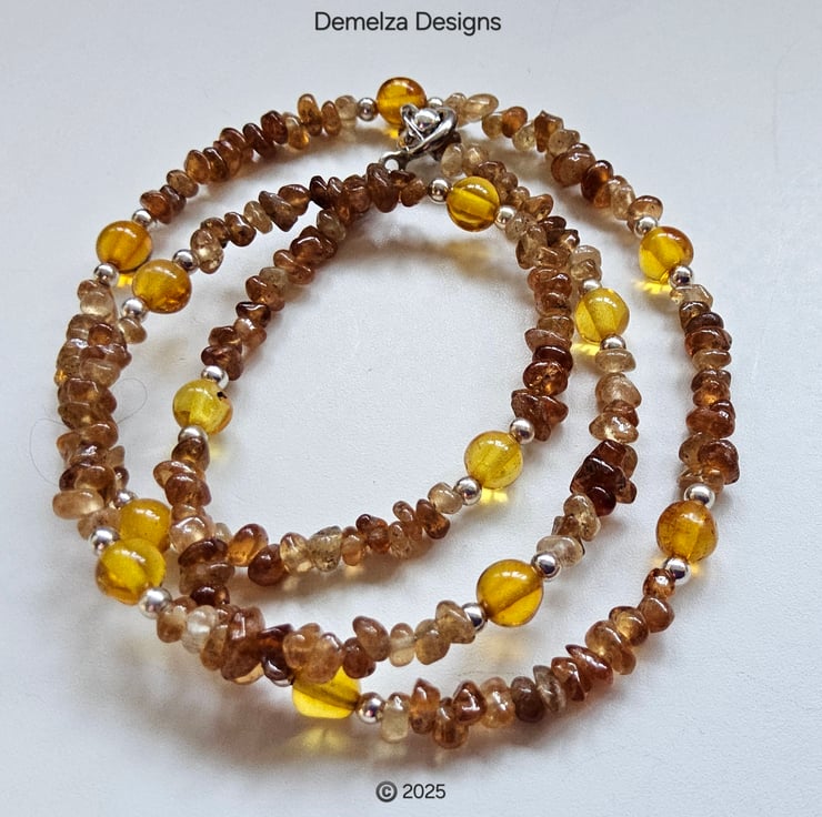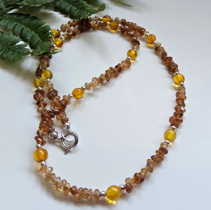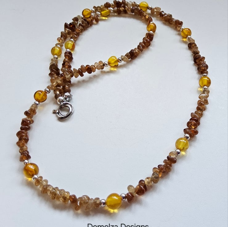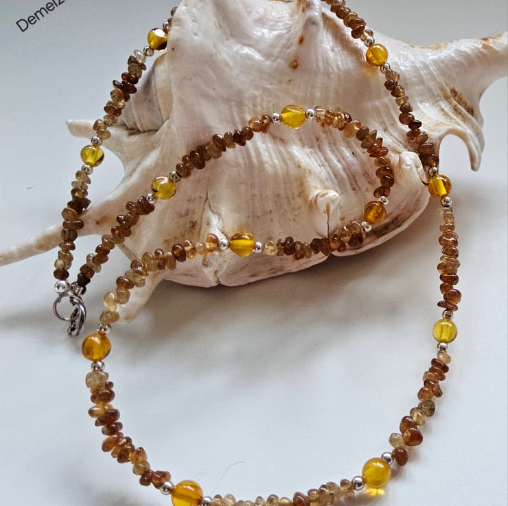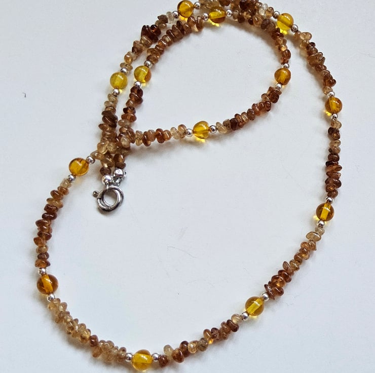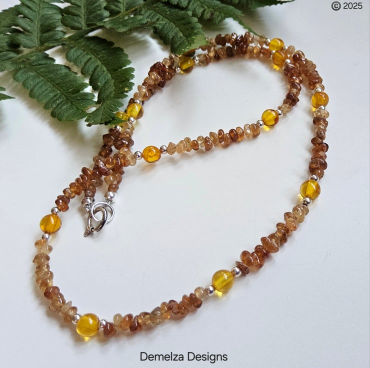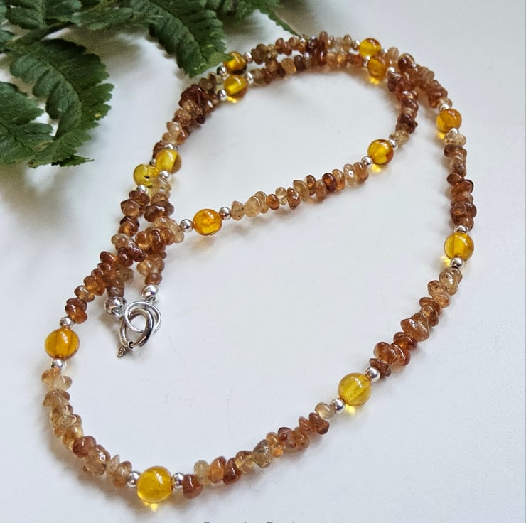 A lovely practical rare hesinite garnet and amber necklace designed and hand crafted in Cornwall using small tumble free nugget garnets complimented with 5mm round natural amber beads from Poland. By the side of each amber are 2mm sterling silver spacer beads adding a touch of sparkle to compliment the warm golden glow from the garnets and amber.