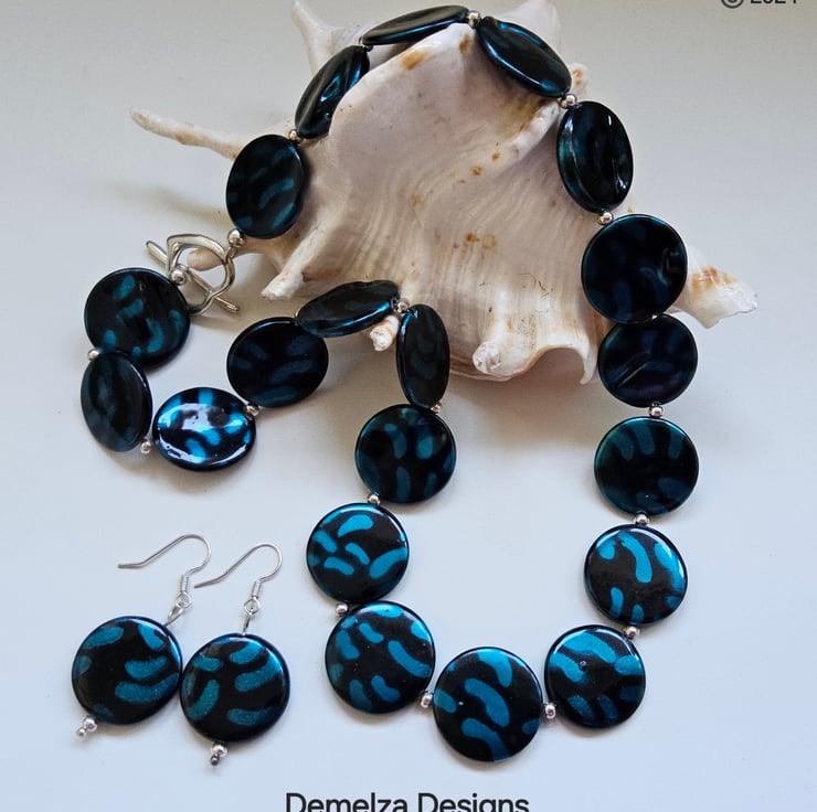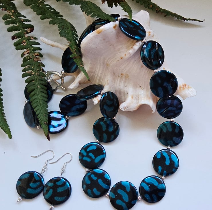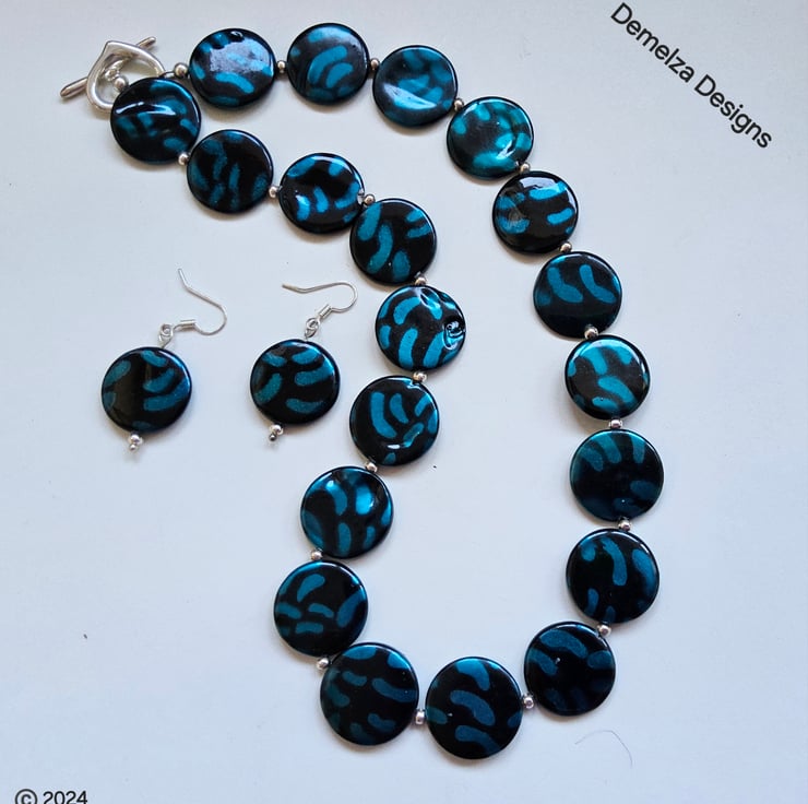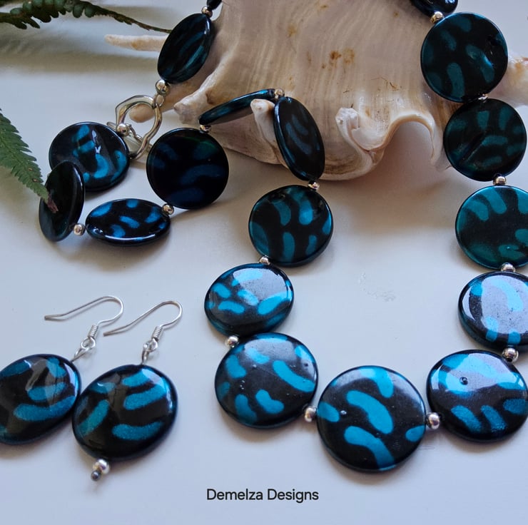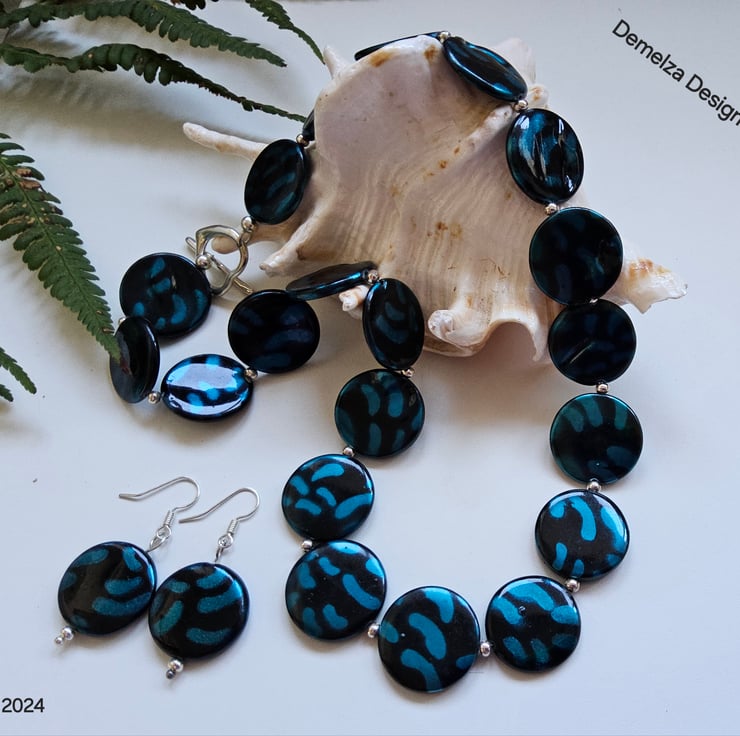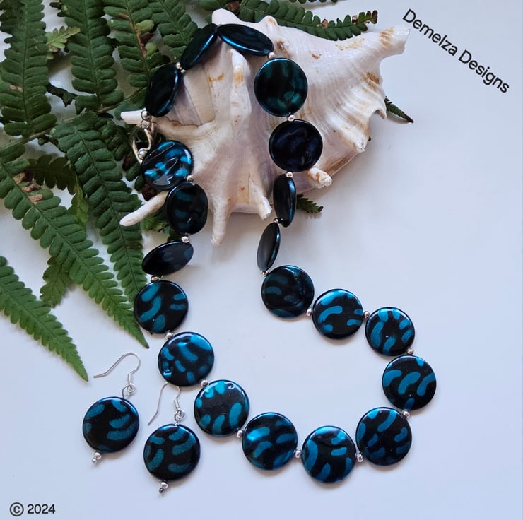 A fabulous statement necklace and earrings set hand crafted using large dyed Animal Print Mother of Pearl flat cut coin shaped gemstones. The treatment applied does not wear off over time.