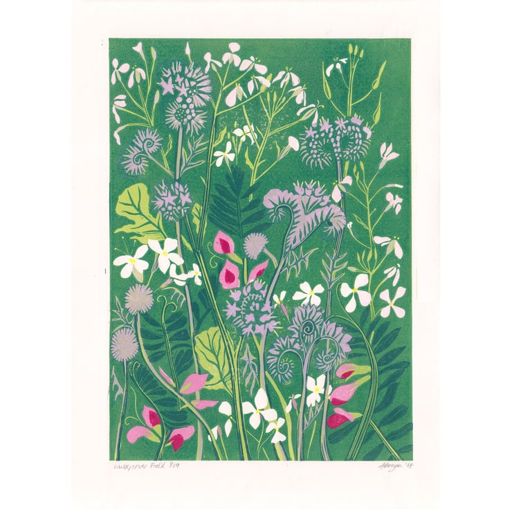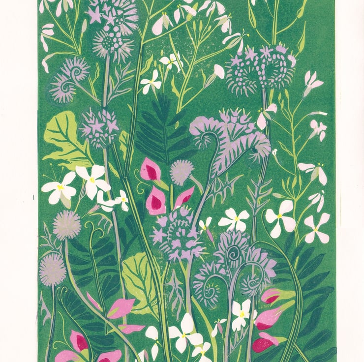 ORIGINAL lino print - WILDFLOWER FIELD - A riot of bright pink vetch, pale lilac phacelia and delicate pink cuckoo flower.