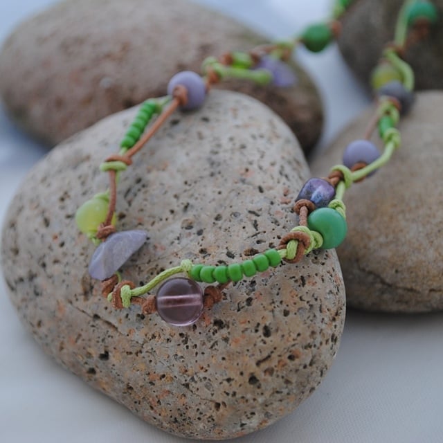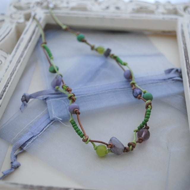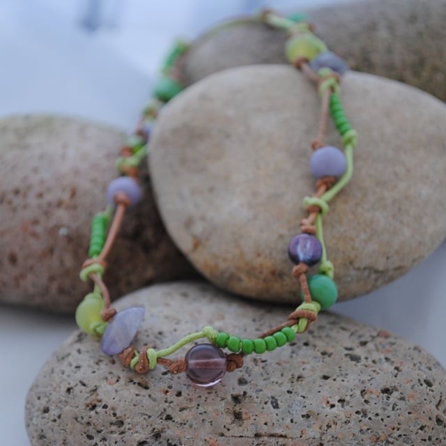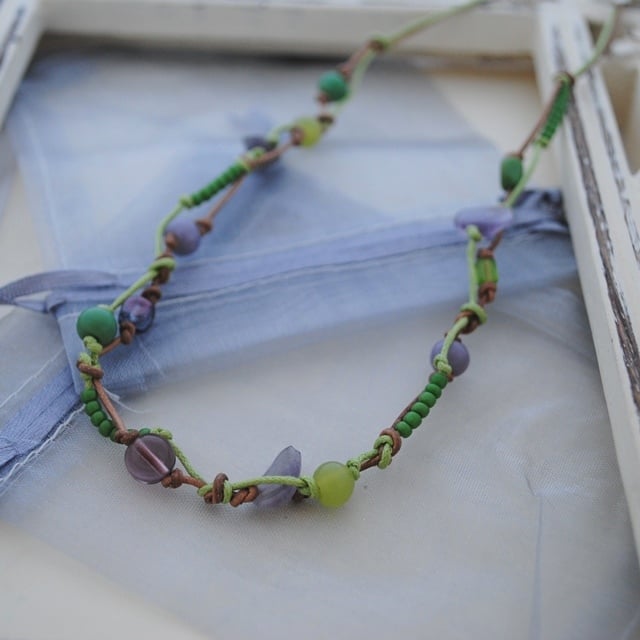 Casual necklace. This necklace is made with hand knotted natural leather and lime waxed cord knotted and twisted with a variety of beads in tones of purple. lime and green. It has also has some amethyst chips.