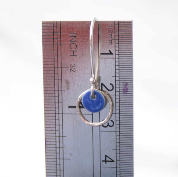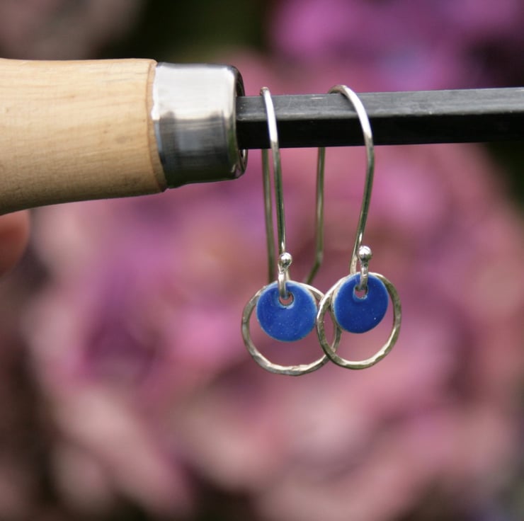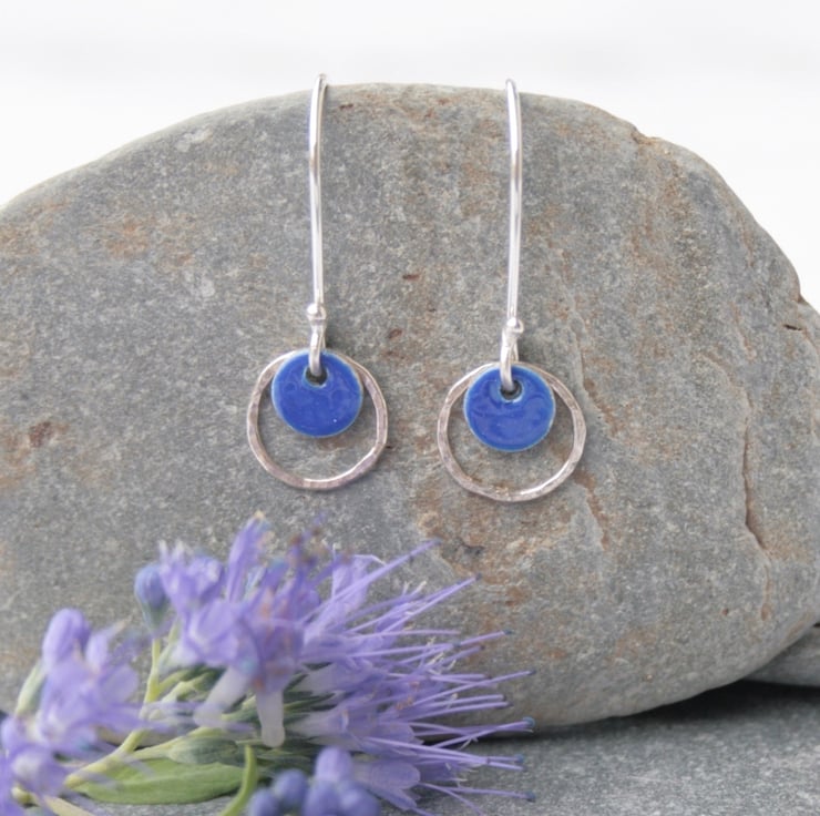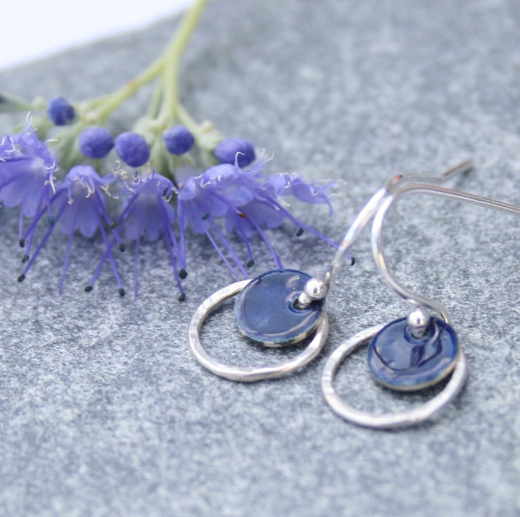 I have handmade these silver and enamel hoop earrings using recycled sterling silver and have enamelled a silver disc in navy blue and added it to hang along with the hammered silver hoop. These silver circle earrings are one of our best sellers and are also available in a pale blue or green colour although please message me if you would prefer them in a different colour.