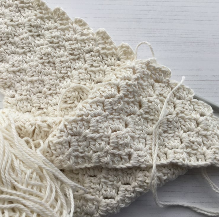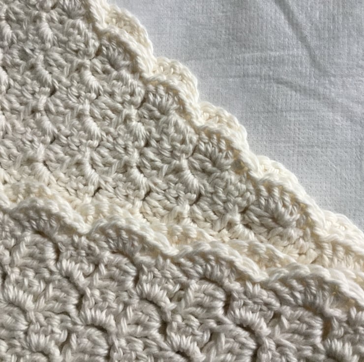 The blanket has been crocheted diagonally using the corner to corner method and is edged with a pretty scalloped border.