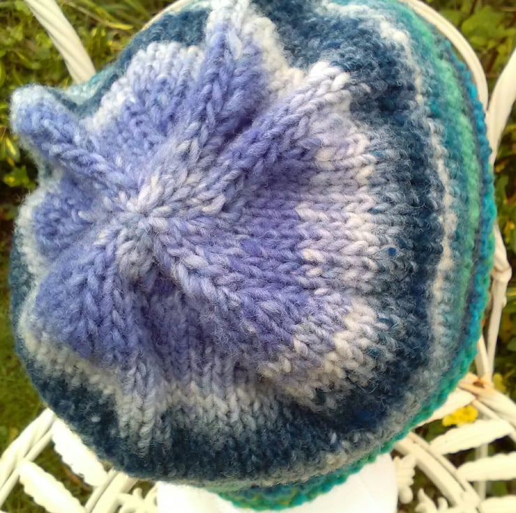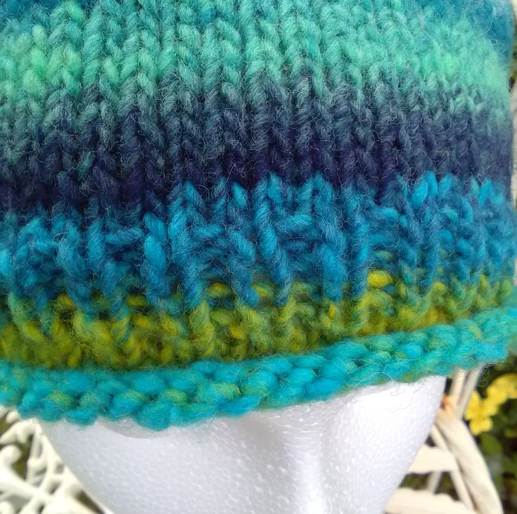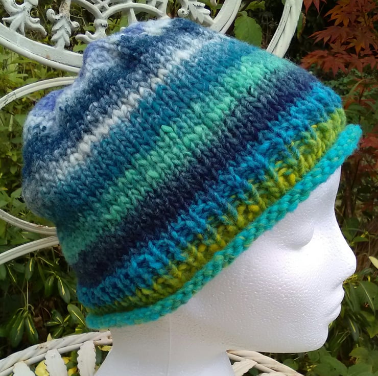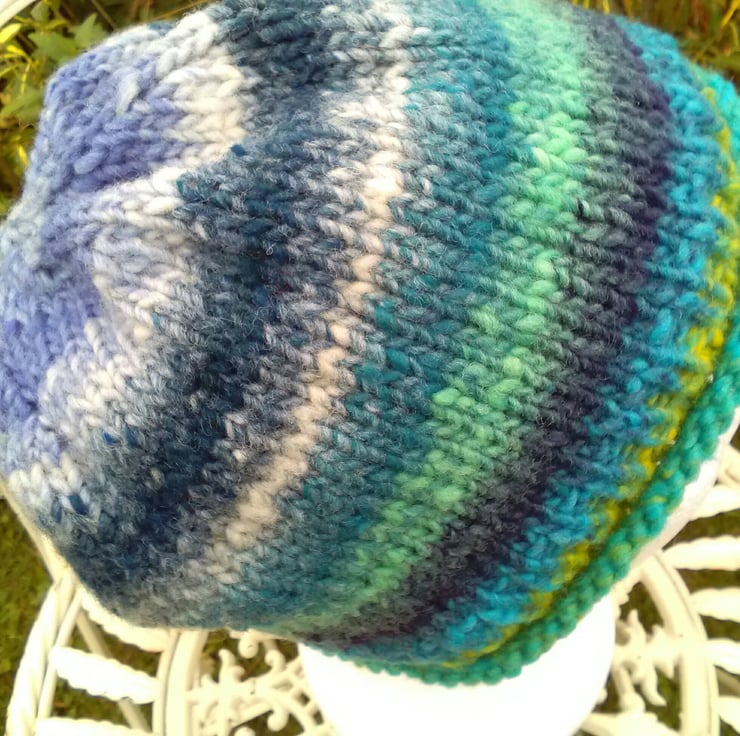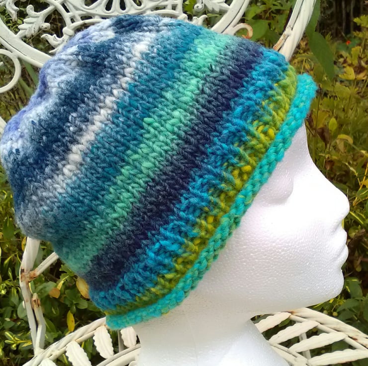 All my hats are one offs using bespoke wools from USA, Germany, Italy & Japan incorporating hand dyes and self striping yarns. They are all made on the round so there are no seams. The stripes are shown off to their full potential! Unusual colour mixes are my favourites which make them so individual.