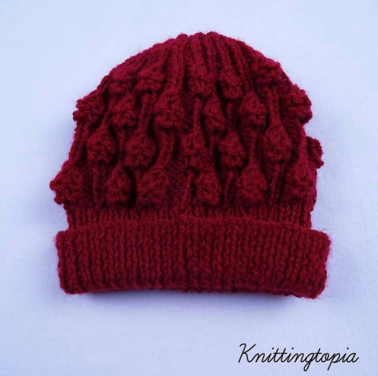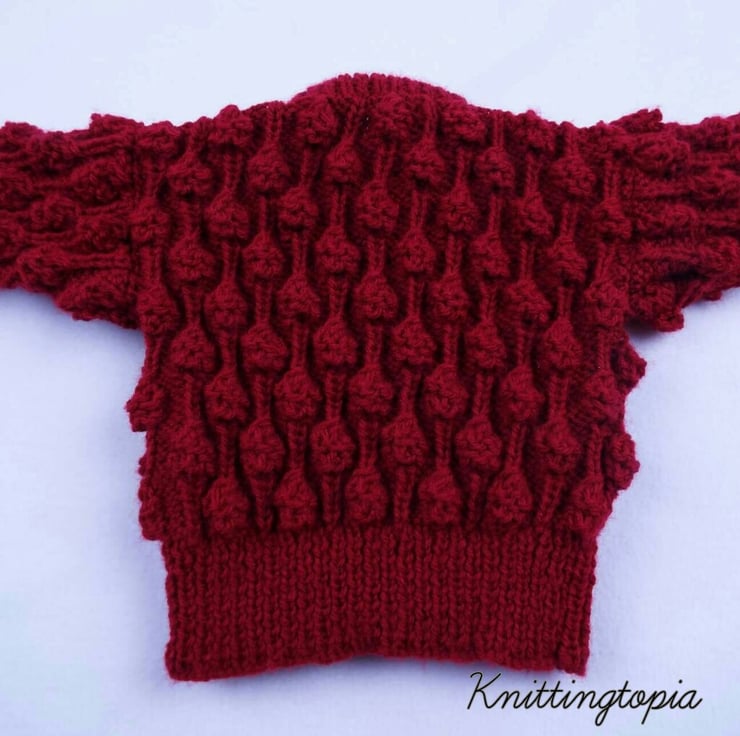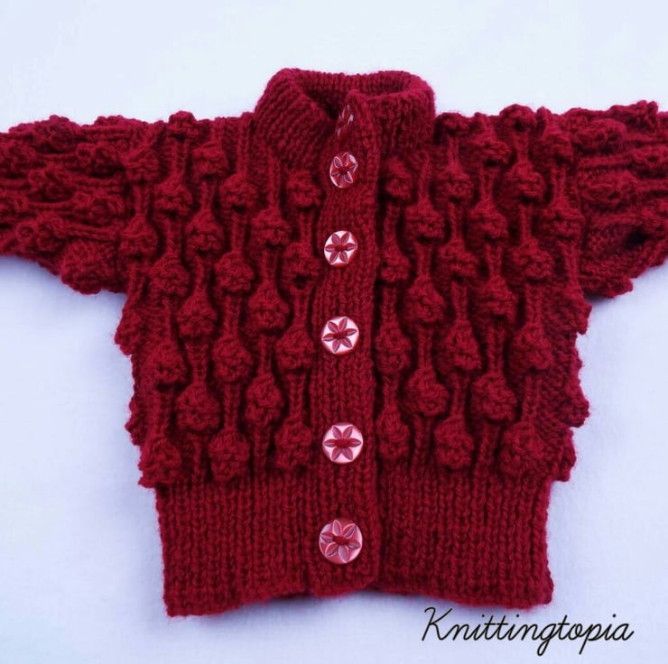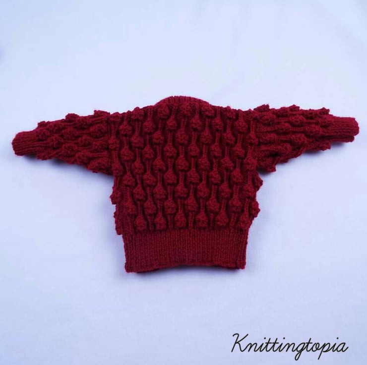 This hand knitted baby cardigan and hat has been knitted in maroon shade of red The cardigan has an all over textured bobble pattern, long sleeves and a round neckline. The hat is knitted in the same bobble pattern to match with the cardigan.