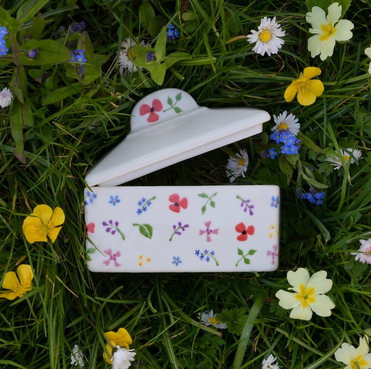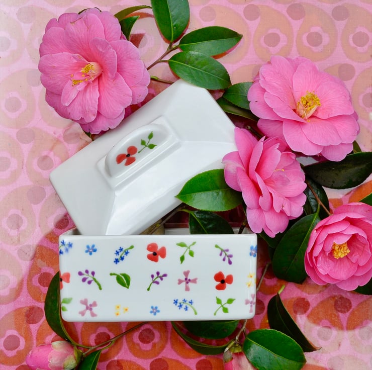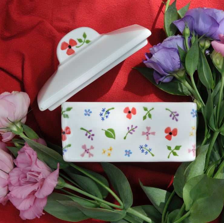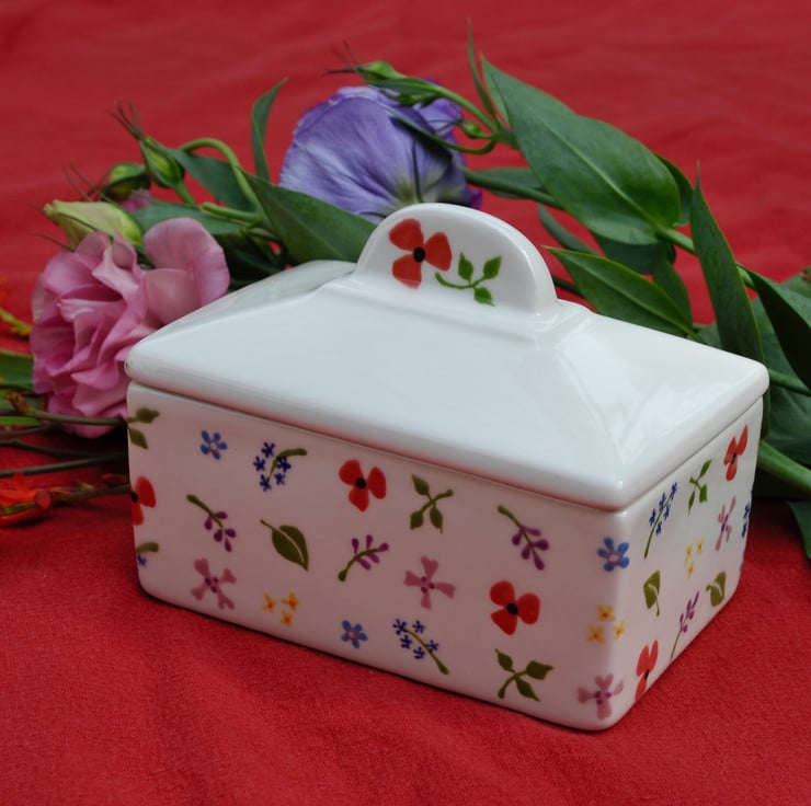 Hand painted wild flowers are doted all over this butter dish, it makes a wonderful new home gift.