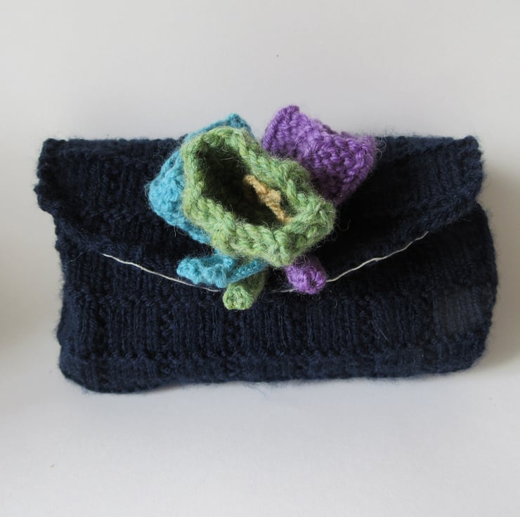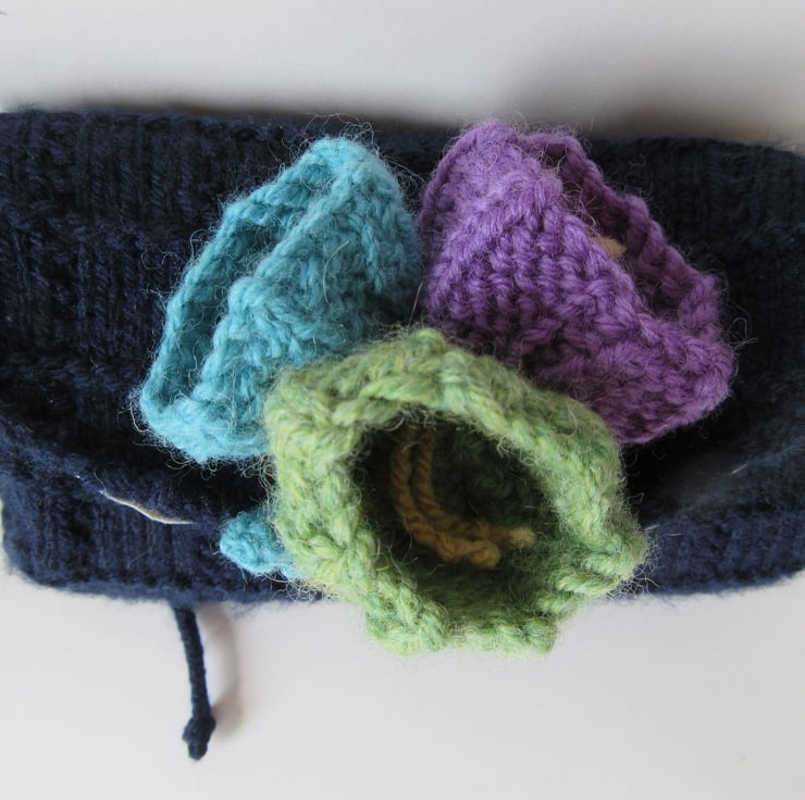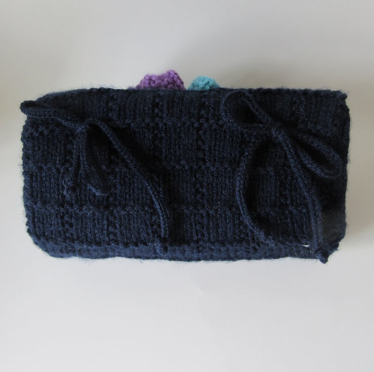 A wonderful navy blue hand knitted ladies bike saddle tool bag. The bag is knitted in a basket weave stitch with 3 different coloured knitted crocus flowers. Three flowers in spring green, lavender and turquoise with sandy coloured stamen, tied to the front with a turquoise cord tie. The inside is lined with an off white PVC fabric, printed with a bold flower pattern. This gives the bag a water repellent layer. Attached on the reverse are 2 x 30cm matching navy cord ties, which are reinforced with buttons on the inside. These ties secure the bag to the underside of the saddle. The saddle bag is closed using a strong popper, also reinforced with a button on the inside.